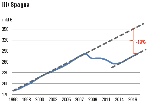Le altre tre economie dell’area euro sono invece ancora lontane dai livelli pre-crisi. La Spagna, tuttavia, registra una ripresa più sostenuta, superiore al 3% in media annua. L’Italia, che già prima della crisi cresceva meno, si sta allontanando ancora di più in termini di sviluppo.