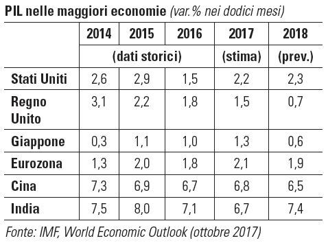 Nel 2017 la crescita dell’economia mondiale è andata ben oltre le attese: sono infatti in gran parte rientrati i timori, che erano molto diffusi tra gli investitori ancora a fine 2016, per i potenziali effetti negativi sul quadro politico-economico internazionale di una serie di consultazioni popolari (referendum sulla Brexit, elezioni presidenziali negli Stati Uniti e in Francia, voto in Germania).