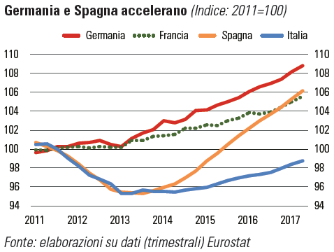 Con questi numeri, alla fine del 2018 l’Italia recupererebbe la caduta del Pil causata dalla seconda recessione (2011-2013), ma rimarrebbe ancora distante rispetto ai livelli pre-crisi del 2008. Per completare il recupero, l'economia italiana dovrebbe accelerare ma la ripresa appare legata alle dinamiche del ciclo internazionale, soprattutto nell'area euro, piuttosto che a un rafforzamento della struttura produttiva del Paese. I ritmi di crescita della nostra economia, inoltre, continuano a rimanere inferiori anche nei confronti di quei Paesi, come la Spagna, colpiti in modo altrettanto pesante dalla lunga recessione. Diventa quindi importante, per la nostra economia, capire se la fase di crescita dell’area euro segnala l’inizio di un nuova fase.