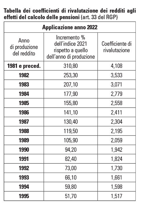 Il CdA, visti gli artt. 33 e 34 del Regolamento Generale Previdenza relativi alla rivalutazione dei redditi per il calcolo delle pensioni e alla rivalutazione delle pensioni e dei contributi, delibera di disporre, dal 1° gennaio 2022 l’aumento nella misura dello 0,2% degli importi dei trattamenti pensionistici erogati da Inarcassa. Infine, delibera di redigere la relativa tabella per il calcolo delle pensioni.
