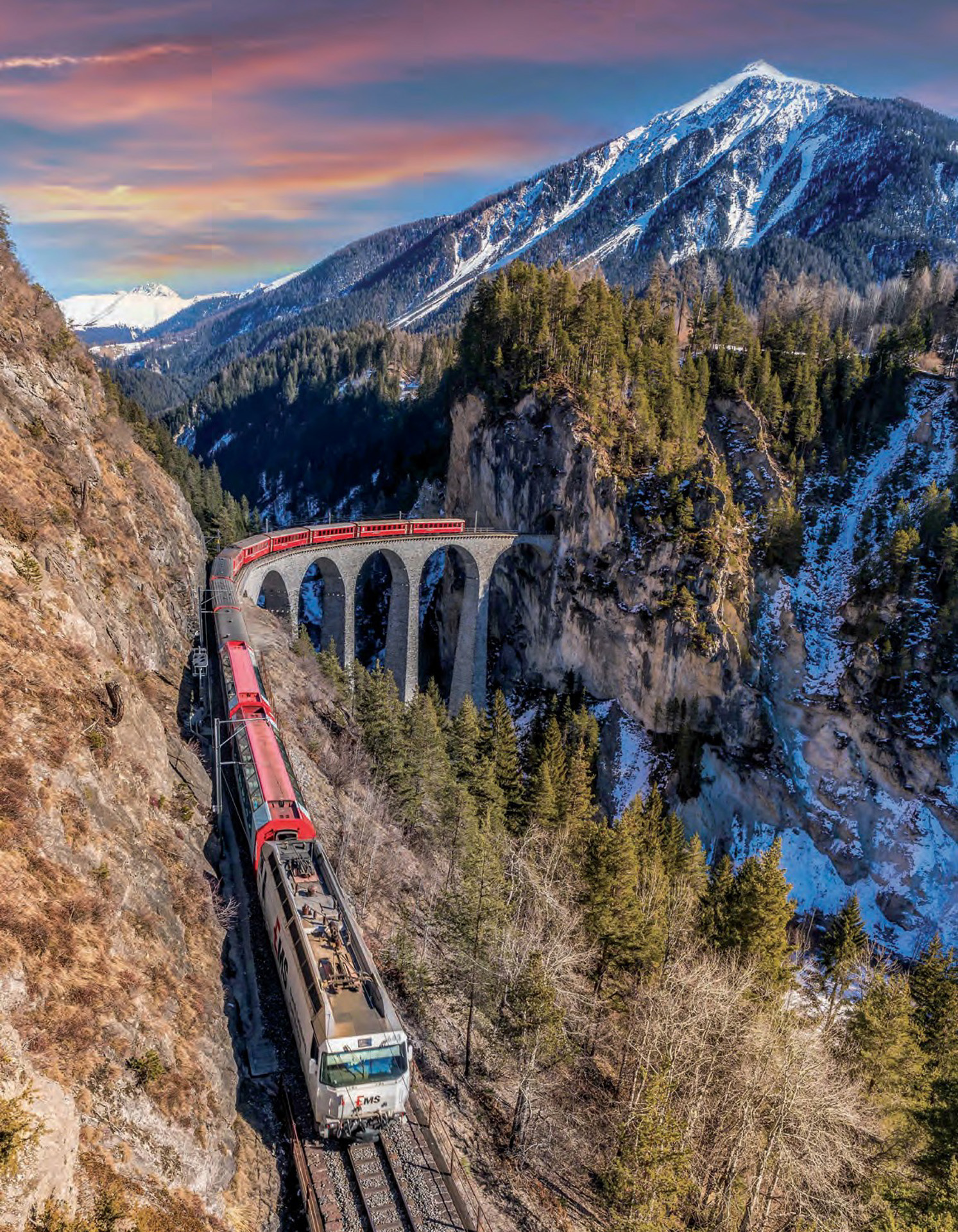 Poco più di 5 mila chilometri. Una ragnatela di “strade di ferro” che connette città, paesi e località turistiche. Le ferrovie svizzere sono un gioiello ingegneristico e architettonico unico nel suo genere. Per unire la Confederazione elvetica e rendere le città più “vicine”, l’uomo ha dato fondo al proprio ingegno per superare quelli che per secoli hanno rappresentato veri e propri muri naturali. Così, per attraversare alte montagne ed evitare grandi salite con i treni, ingegneri e architetti hanno realizzato dalla fine dell’800 opere pionieristiche come ponti altissimi, lunghe gallerie e rampe elicoidali. Molti di questi capolavori, ai quali è dedicato il fil rouge di questo numero, si concentrano lungo la Ferrovia retica, che attraversa le montagne grigionesi tra l’Albula e il Bernina. È dal 1889 che i mitici trenini rossi attraversano montagne e valli, e rappresentano, insieme all’infrastruttura, un esempio di innovazione tecnica sostenibile, che coniuga modernità e tradizione. Per questo la Ferrovia retica è oggi uno dei 12 siti elvetici riconosciuti Patrimonio mondiale dell’Unesco.