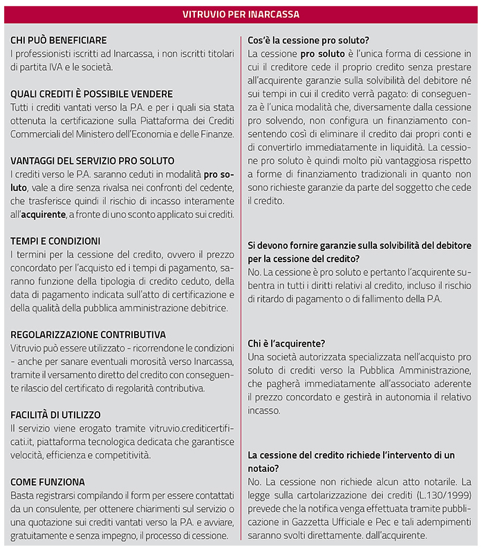 Ma c’è di più. Vitruvio può essere utilizzato – ricorrendone le condizioni – anche per sanare eventuali morosità verso Inarcassa, attraverso il versamento diretto del credito con il conseguente rilascio del certificato di regolarità contributiva.
