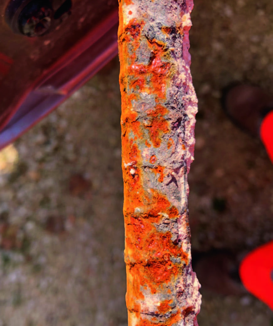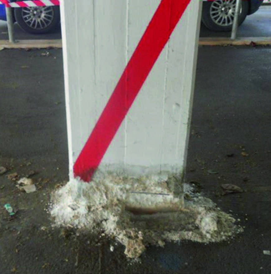 L’esposizione agli agenti atmosferici inoltre è anche causa del dilavamento della calce libera. Il calcestruzzo cosi impoverito si danneggia in modo importante e facilita l’esposizione delle barre privandole della originaria protezione. ■