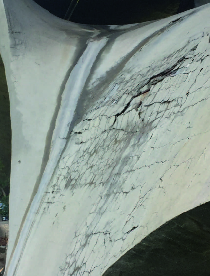 Nella foto 6 è riportato un dettaglio della membrana equicompressa del ponte sul Basento di Sergio Musmeci 1. Le fessurazioni da ritiro idraulico costituiscono ingresso agli agenti degradanti della pasta cementizia e delle armature. Infatti, le infiltrazioni di acqua inquinata da cloruro di calcio – proveniente dalla sede stradale e utilizzato come sale disgelante – trasportano lo ione cloruro che, come detto in precedenza, crea le condizioni elettrochimiche per la corrosione delle barre di armatura e, inoltre, il degrado della pasta cementizia attraverso la formazione dell‘ossicloruro di calcio idrato.