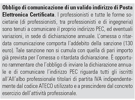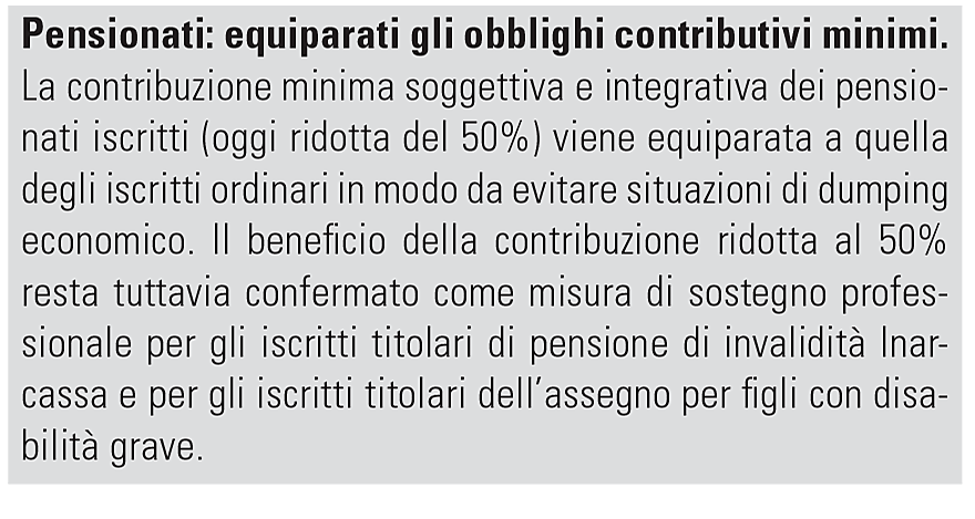 Deroga al contributo soggettivo minimo. L’opzione di derogare al versamento del contributo soggettivo minimo per un numero massimo di cinque anni nella carriera era già esclusa per i pensionati Inarcassa e per i giovani professionisti fino a 35 anni che beneficiano della contribuzione ridotta. Per ragioni di equità dal 2021 saranno esclusi dall’agevolazione i pensionati di altro ente previdenziale (tranne i titolari di pensione di invalidità civile dell’INPS). La mancata comunicazione annuale obbligatoria entro il 31 dicembre dell’anno in cui deve essere presentata è causa di decadenza del beneficio e il pagamento di sanzioni e interessi.