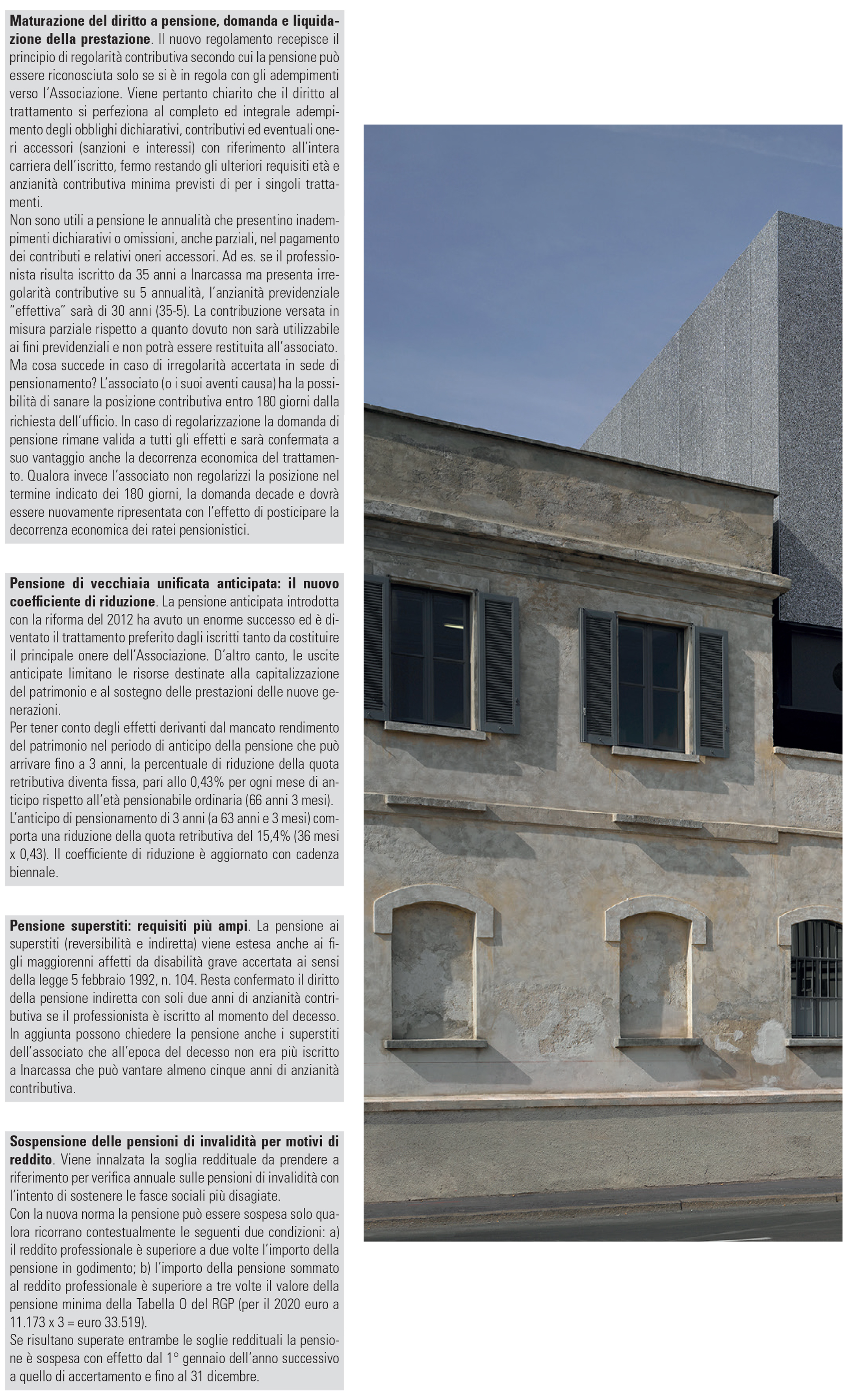 Entrano in vigore dal 1° gennaio 2021 le novità al sistema pensionistico Inarcassa nel segno di una maggiore equità, attenzione alle fasce più deboli e semplificazione degli adempimenti. Tra le modifiche più rilevanti l’obbligo della PEC, la parità di contribuzione minima tra iscritti e pensionati, ulteriori tutele per i pensionati di invalidità e nuclei superstiti, nuovo coefficiente di riduzione per la pensione anticipata, possibilità di mettersi in regola entro 180 giorni dalla domanda di pensione, limitazione a cinque anni dei poteri di accertamento e rettifica degli uffici. Confermata la ricongiunzione con opzione gratuita dei periodi fino al 2012 per coloro che possono vantare almeno 15 anni di anzianità a Inarcassa al momento della domanda.