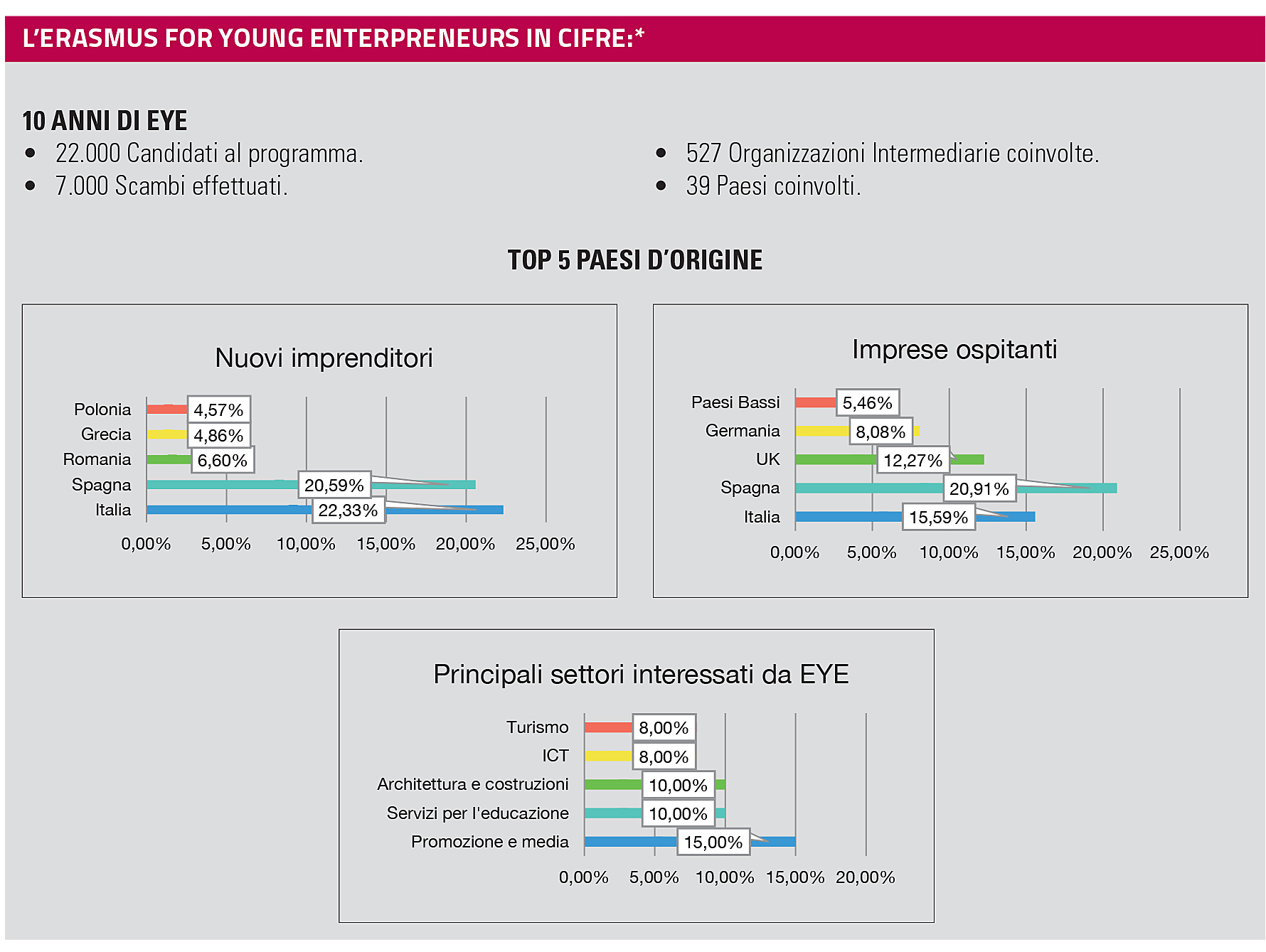 Il programma, promosso dalla Ue, offre la possibilità di soggiornare per un periodo da 1 a 6 mesi non solo in tutti i paesi dell’Unione, ma anche in Israele, Singapore e negli Usa (Pennsylvania e New York) grazie al programma pilota EYE Global. Nato nel 2009 come progetto pilota pensato per le imprese – il 18 marzo scorso ha avuto luogo la celebrazione del decennale –, l’EYE è stato ufficilamente esteso anche ai professionisti nel 2013, di pari passo con l’equiparazione a beneficiari di fondi europei.