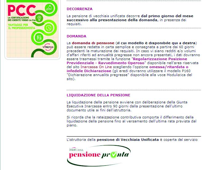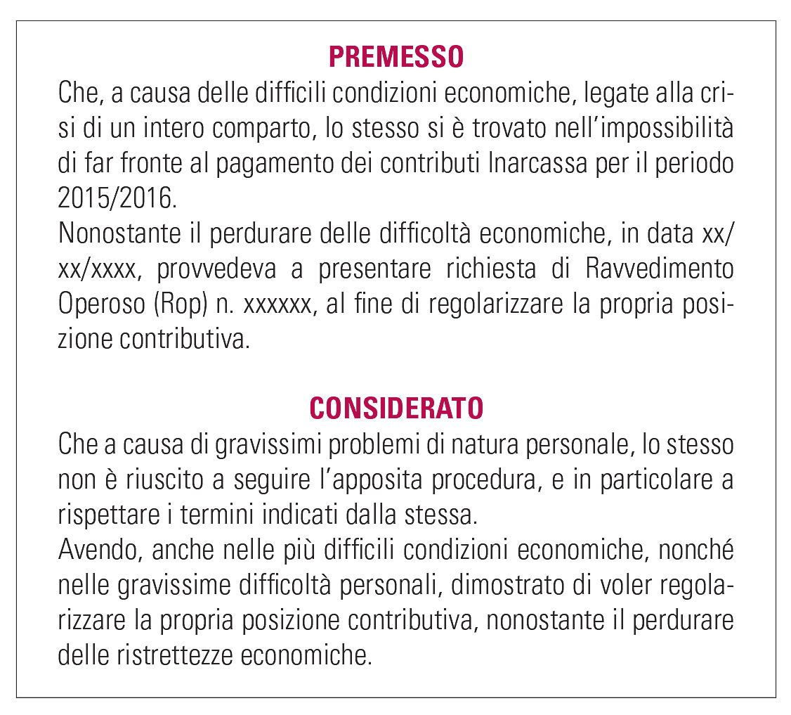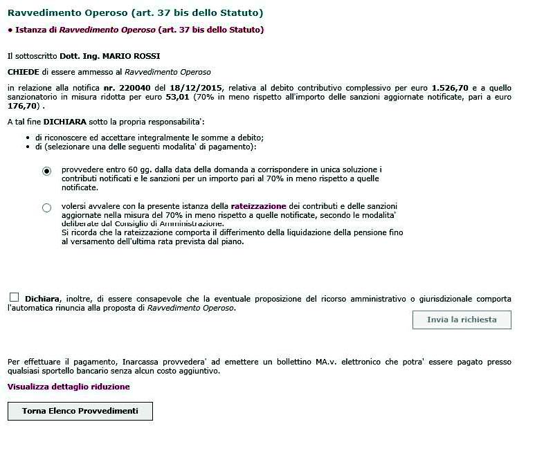 | “…Se conferma la Sua richiesta di ROP, l’importo delle sanzioni (come da “PROSPETTO SANZIONI E INTERESSI” allegato), pari ad euro 83,00, sarà ridotto ad euro 24,90 e il Suo debito comprensivo dei contributi, delle sanzioni ridotte e degli interessi, sarà quindi pari ad euro 1.564,30. A tal fine deve, entro il 29-10-2018, utilizzare l’apposita procedura disponibile nella Sua area riservata su Inarcassa On Line, nella sezione “Regolarizzazione posizione previdenziale - Ravvedimento Operoso” facendo riferimento al provvedimento n. 411211, dove troverà tutte le informazioni necessarie per indicare la modalità di versamento: • in un’unica soluzione generando il bollettino M.AV. con data scadenza 29-10-2018; • in 10 rate quadrimestrali, per un periodo di 36 mesi, con un tasso annuo di interesse del 4,00% sul debito contributivo e dello 0,30% sul debito sanzionatorio. Le ricordiamo che la rateizzazione contributiva comporta il differimento della liquidazione della pensione fino al versamento dell’ultima rata prevista dal piano. Dopo il 29-10-2018 o nel caso in cui Lei non intenda avvalersi di questo istituto, gli importi notificati a titolo di sanzioni e interessi, pari a euro 98,40 dovranno essere versati entro il 31-01-2019 tramite il bollettino M.AV. elettronico che Le sarà reso disponibile in tempo utile per il rispetto dei termini nella Sua area riservata su Inarcassa On Line, alla voce “Gestione M.AV.” e dovrà inoltre versare il debito contributivo utilizzando i bollettini M.AV. già in Suo possesso o disponibili su Inarcassa On Line, sempre alla voce “Gestione M.AV.”…”. |
