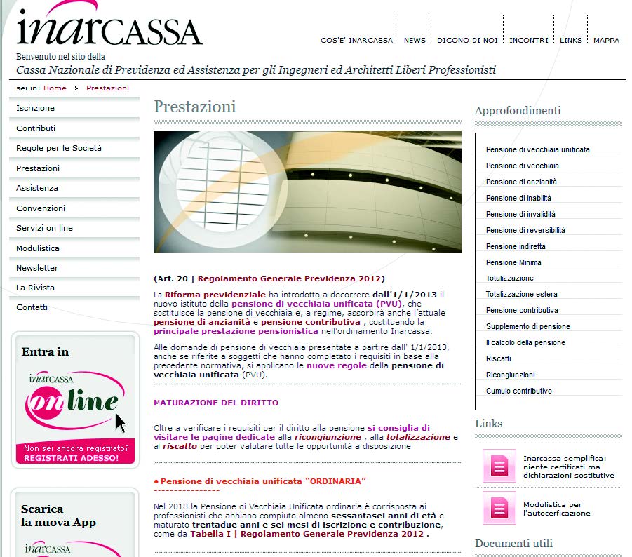 Dall’analisi del comportamento dei nostri associati e allo scopo di evitare occasioni di errate interpretazioni che impegnano il professionista a contattarci e noi a rispondere su semplici chiarimenti abbiamo previsto, nel progetto del nuovo Inarcassa On Line, di modificare la homepage. La riflessione in corso è di creare il cosiddetto “cruscotto previdenziale” che darà informazioni chiare e sintetiche sulla posizione assicurativa all’associato, garantendo così anche maggiore trasparenza.