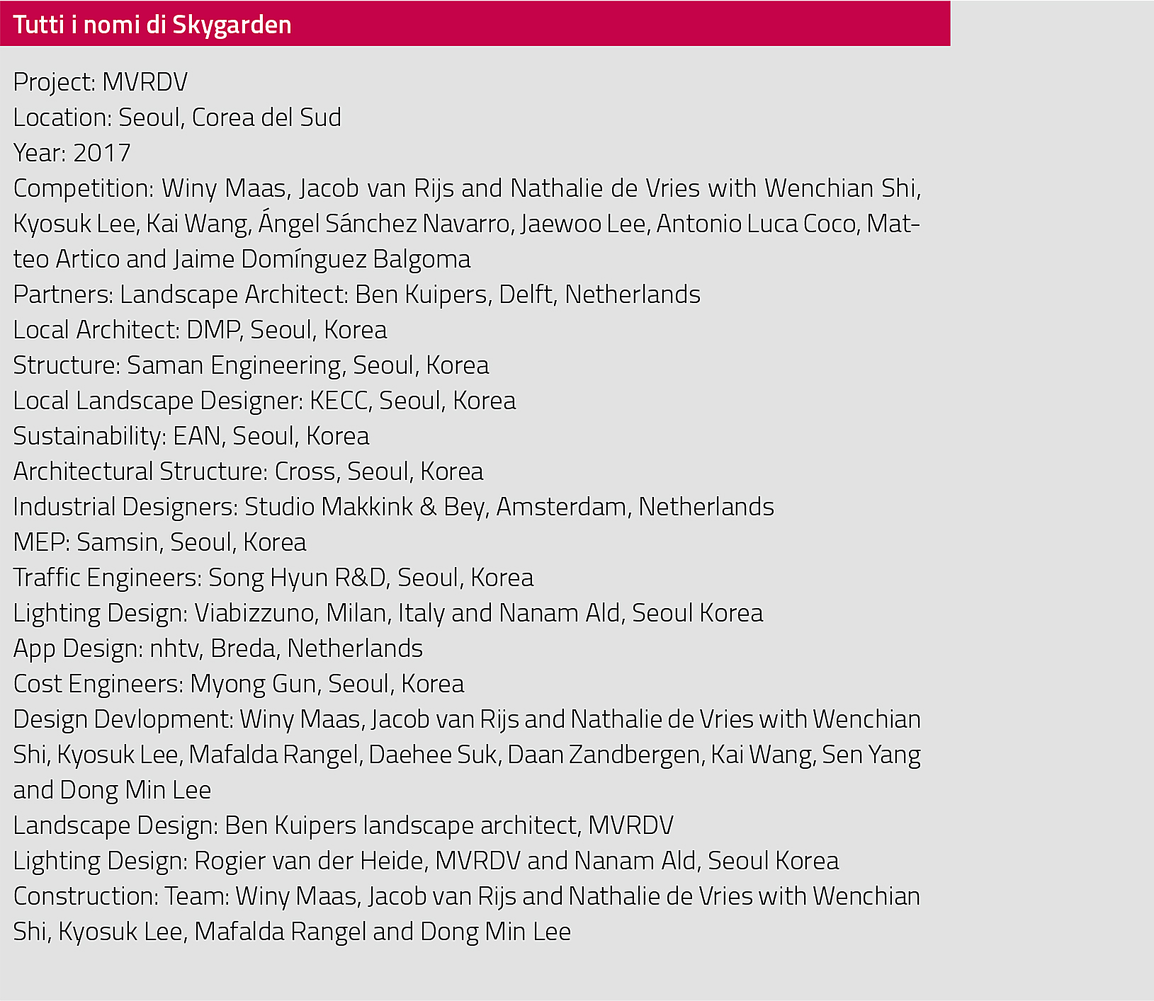 Lo Skygarden Seoullo 7017, progettato dal gruppo olandese MVRDV, è un primo importante passo di un percorso di sostenibilità urbana voluto dal sindaco di Seul, Won-soon Park e segue il filone di ricerca nel landscape design già aperto da alcuni anni, proprio a Rotterdam, dal collettivo Observatorium. Nato nel 1997 per iniziativa degli artisti Geert van de Camp, Andre Dekker e Ruud Reutelingsperger, Observatorium è una delle voci più originali nel panorama europeo del landscape design. Azioni artistiche sul paesaggio che nascono con l’obiettivo di ridare valore al vuoto urbano e al “già esistente ma inutilizzato”, concepite per essere inserite immersivamente nella dimensione sociale della città.
