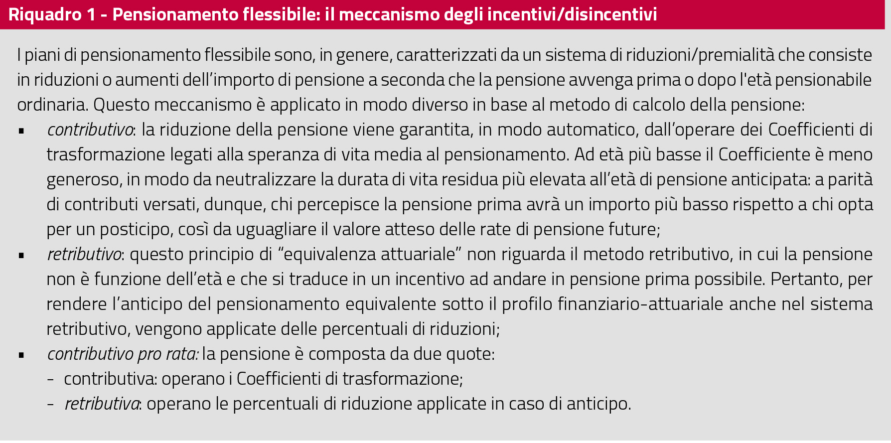 La libertà di scelta sul momento del pensionamento è un elemento caratterizzante il metodo contributivo, riflette "preferenze" e situazioni personali in termini di conciliazione dei tempi di vita e di lavoro. L’anticipo della pensione, però, non può essere “a costo zero” per l’assicurato: deve essere “scambiato” con una pensione di importo più basso. La prestazione dovrà essere ridotta in misura proporzionale agli anni di anticipo rispetto all’ordinaria età pensionabile, per non creare iniquità tra gli associati e per non gravare interamente sui conti finanziari del sistema previdenziale e dunque sulle future generazioni (cfr. riquadro 1).