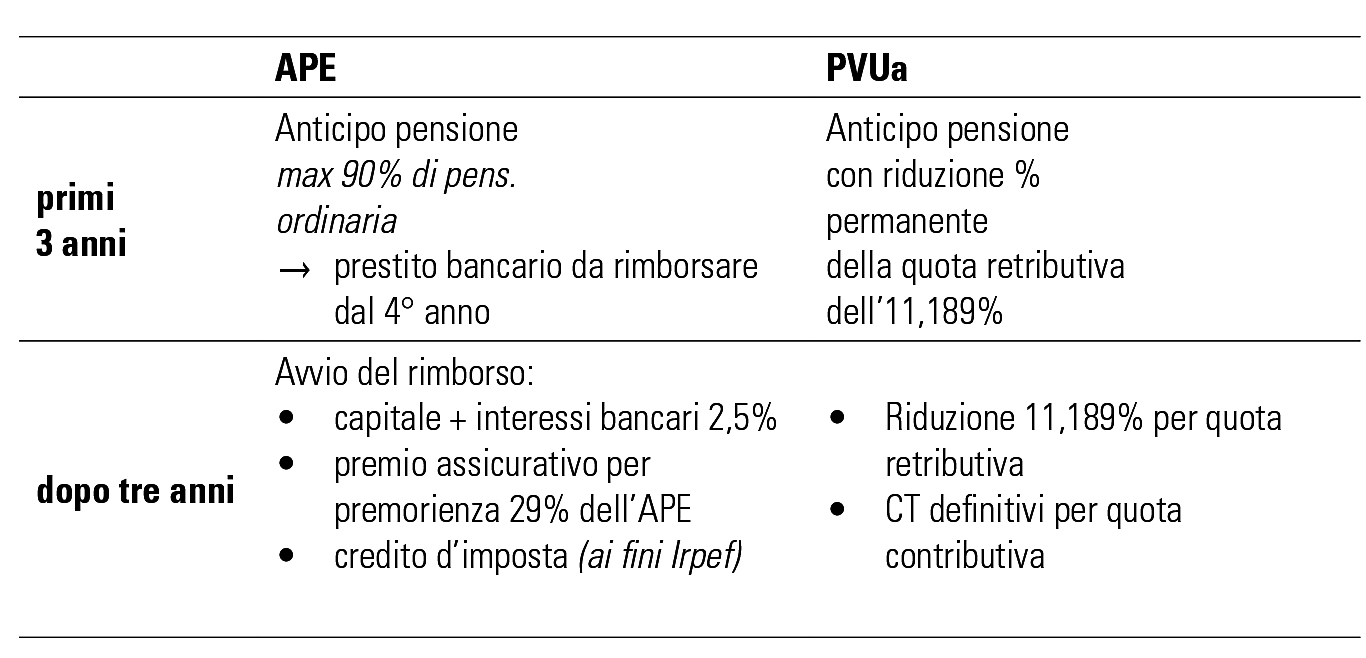 I due meccanismi sono diversi perché rispondono a due logiche differenti: la PVUa è determinata esclusivamente in base a una riduzione di “natura attuariale”, applicata alla quota retributiva della pensione per tutti gli anni di quiescenza; l’APE è, invece, un prestito, che deve essere rimborsato dal soggetto interessato. L’importo dell’anticipo scelto può oscillare tra un minimo e un massimo della pensione ordinaria: in base alle informazioni disponibili l’importo massimo non dovrebbe superare il 90% della pensione ordinaria.
