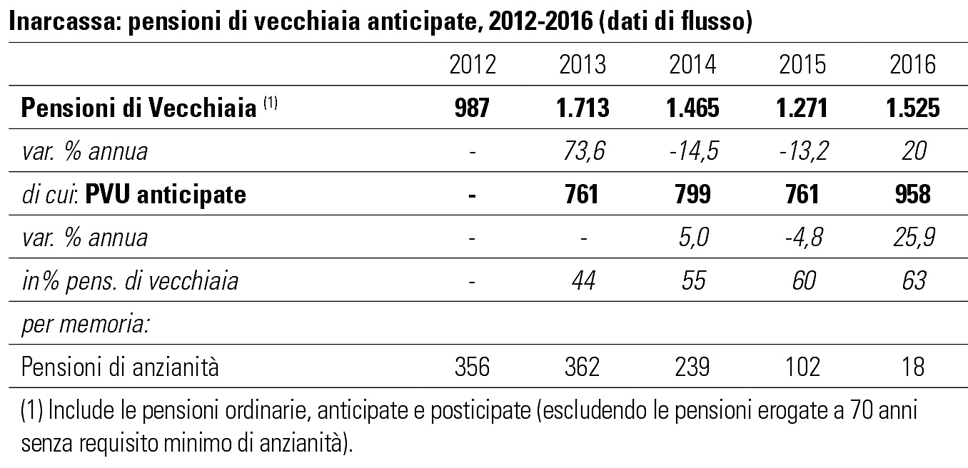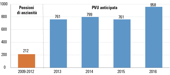 L’aumento del numero delle PVU anticipate è anche da ricondurre alla presenza di requisiti ordinari via via più stringenti (+1 anno sia per l’età che per l’anzianità nel periodo 2013-2017), a fronte della possibilità di anticipare il pensionamento sempre a 63 anni.