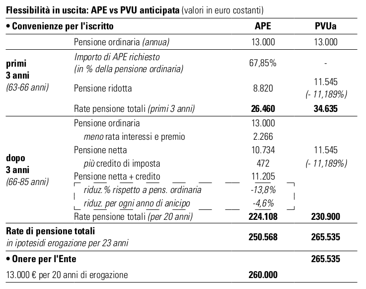 A parità di ipotesi nello scenario considerato, le “regole” dell’APE dovrebbero determinare, a confronto con la PVU anticipata, una minore spesa per un Ente previdenziale e una minor convenienza dell’APE a livello individuale per riduzioni della pensione più elevate rispetto alla PVU anticipata.