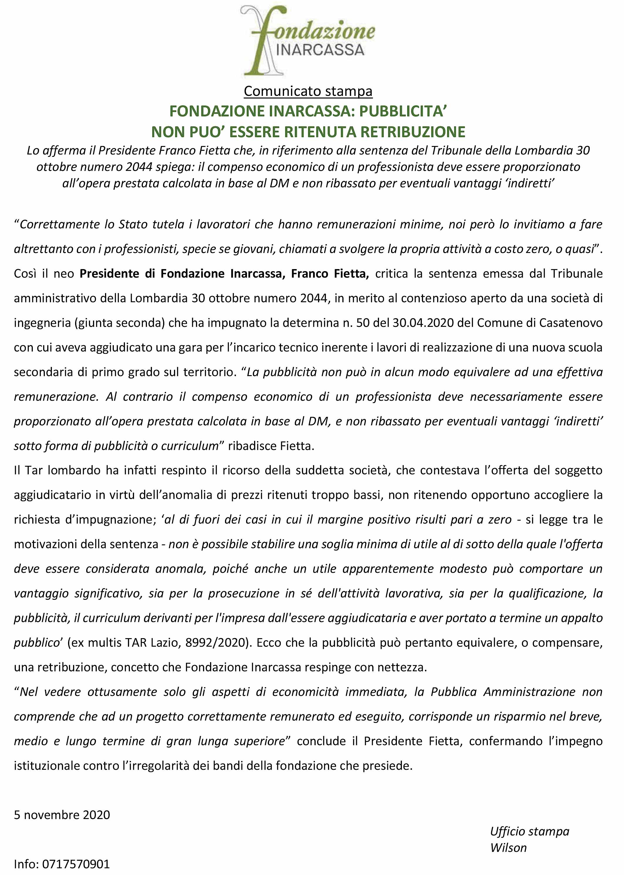 Obbiettivi e attività Per raccogliere la sfida è stata colta l’occasione di una fresca sentenza del TAR della Lombardia n. 2044 del 30 ottobre 2020, per trasmettere il nostro primo comunicato stampa a difesa di una corretta valutazione dei corrispettivi dei tecnici liberi professionisti che molto semplicemente riprende un proverbio: “chi più spende meno spende”. Il significato è molto semplice, chi spende di più e acquista beni o servizi affidabili e di qualità ha molte meno probabilità di andare incontro a disagi e problematiche che porteranno a ulteriori spese, rendendo vano il risparmio iniziale.
