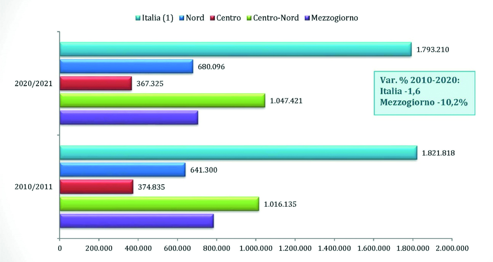 Iscritti all’università per anno accademico e area geografica di residenza 2010/11 – 2020/21. Gli iscritti fanno registrare nel periodo considerato una diminuzione nel Paese dell’1,6% - da 1.821.818 a 1.793.210 -, mentre il numero cresce o diminuisce in funzione dell’area geografica di residenza.
