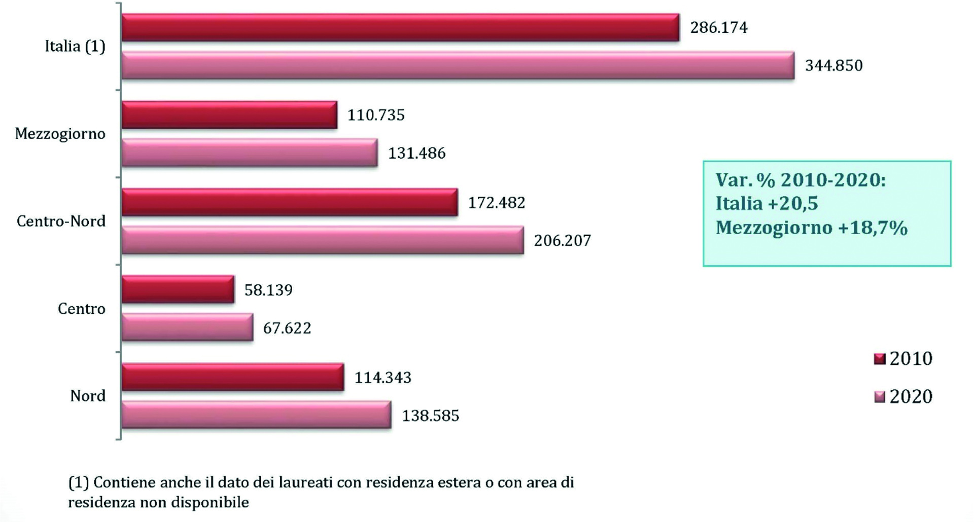 Laureati all’università nell’anno per area geografica di residenza, 2010 e 2020 (v.a.)