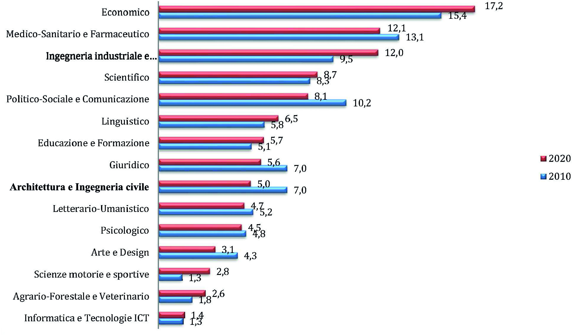 Laureati nelle università italiane per gruppi disciplinari, 2010 e 2020. Il gruppo disciplinare Economico fa rilevare la maggiore percentuale di laureati e in crescita, con una variazione dal 15,4% al 17,2 %, quello Medico-Sanitario- Farmaceutico invece subisce una riduzione dal 13,1% al 12,1%, appena sotto, troviamo Ingegneria Industriale e dell’Informazione che salgono dal 9,5% al 12,0%, mentre, più staccato e con una flessione dal 7,0% al 5,0 %, il gruppo delle discipline di Architettura e Ingegneria Civile.