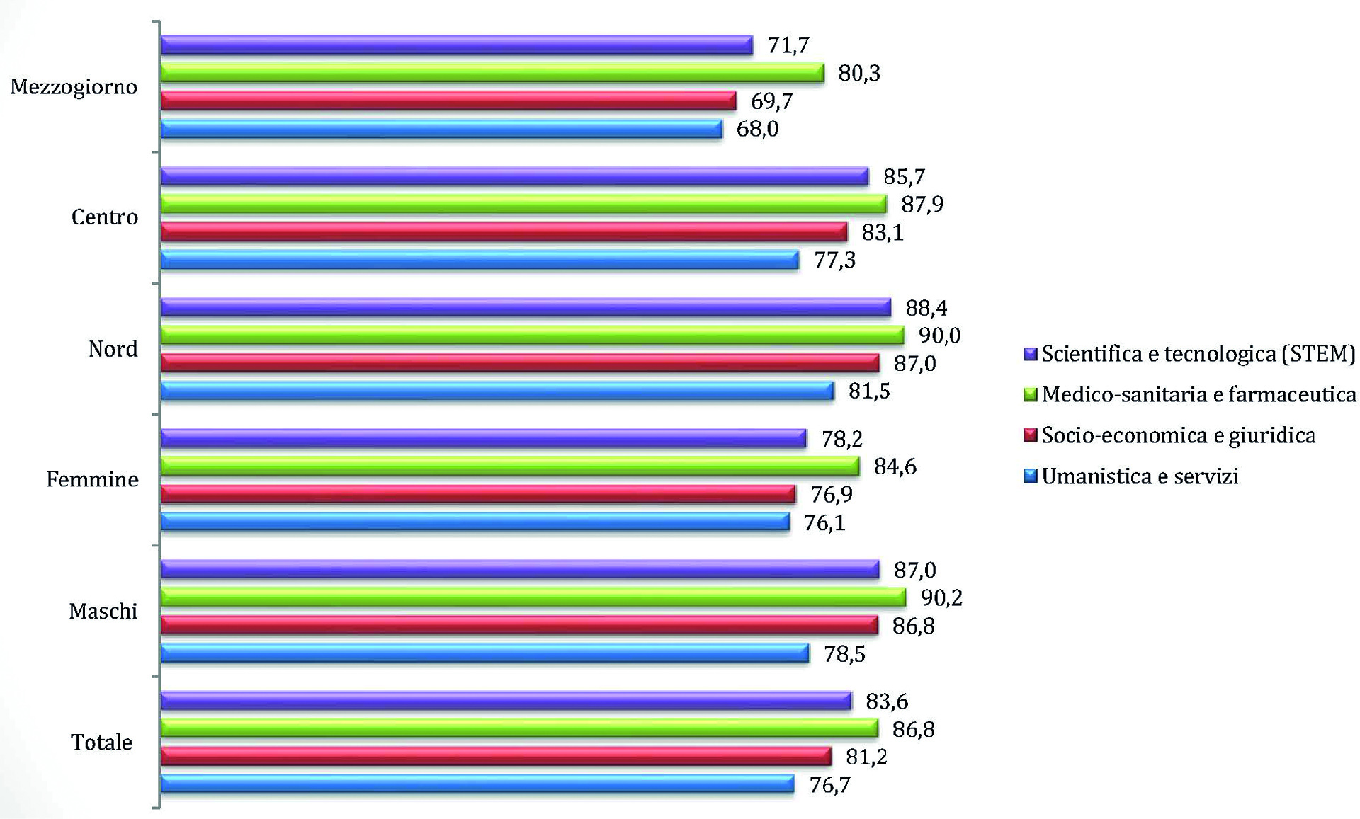 Tasso di occupazione dei laureati di 30-34 anni per area disciplinare, genere e ripartizione geografica, 2019. L’area disciplinare prevalente nel Paese, per aree geografiche e nella distinzione di genere è rappresentata dall’area Medico-Sanitaria-Farmaceutica fra l’80,3% e il 90,2%; a seguire la Scientifica e Tecnologica variabile fra 71,7% e 88,4%, la Socioeconomica e giuridica fra 69,7% e 87,0%, infine l’area umanistica e servizi con una forbice fra 68,0% e 81,5%.