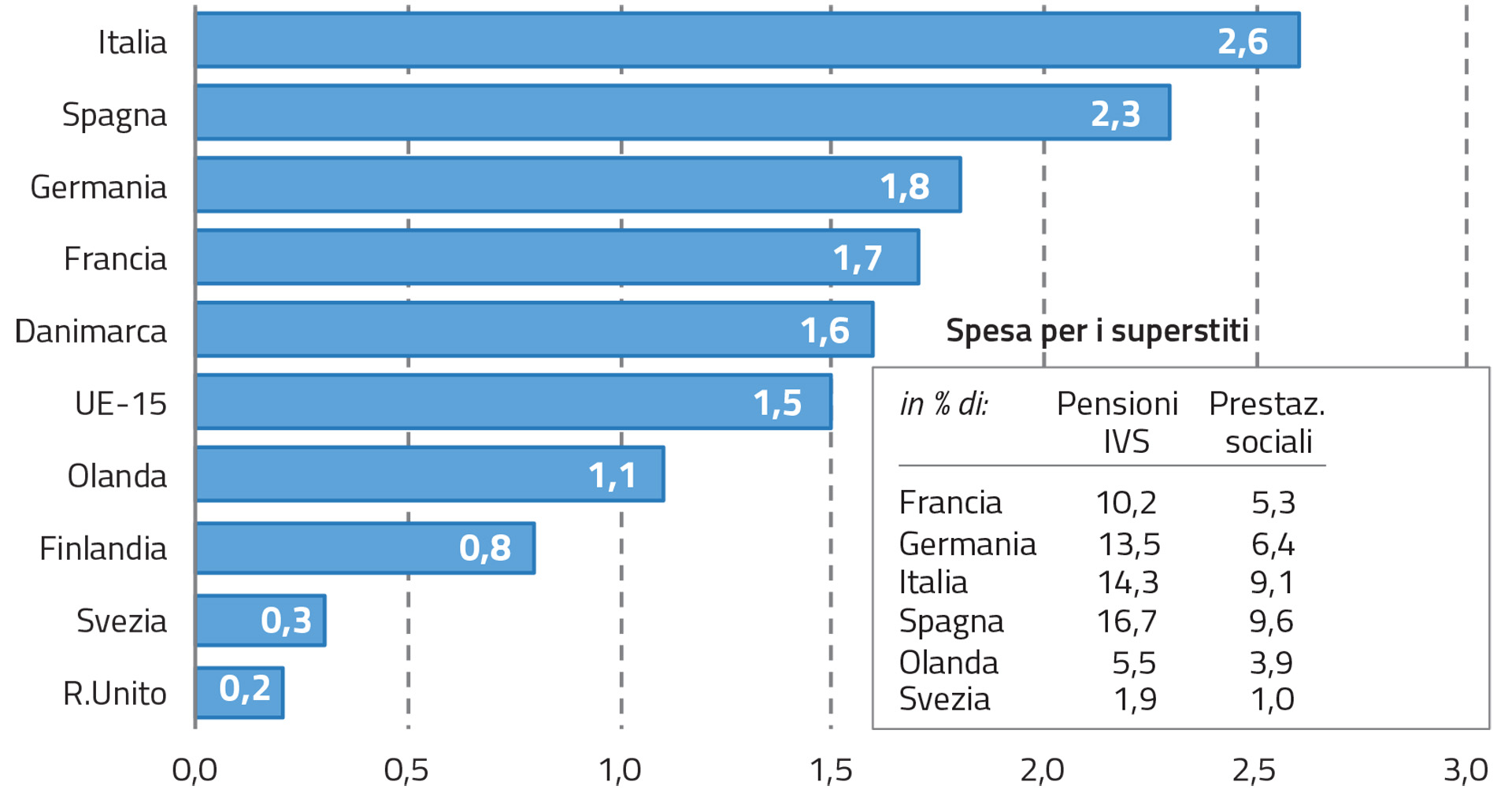 Ammontare della pensione ai superstiti. In Italia la prestazione è pari al 60% della pensione diretta del coniuge deceduto; in Germania, in seguito alla riforma delle pensioni del 2001, è stata ridotta dal 60% al 55%. In Francia e Spagna la quota è pari, rispettivamente, al 54% e al 52%, ma arriva al 60% o oltre al raggiungimento dell’età pensionabile ordinaria da parte del coniuge superstite. Per il figlio superstite, Spagna e Italia prevedono il 20% della pensione del coniuge deceduto, mentre la Germania il 10%.