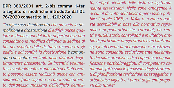La prima importante modifica riguarda l’articolo 2-bis comma 1-ter “Deroghe in materia di limiti di distanza tra fabbricati” in caso di interventi di demolizione e ricostruzione. In questo caso il testo viene completamente riscritto: