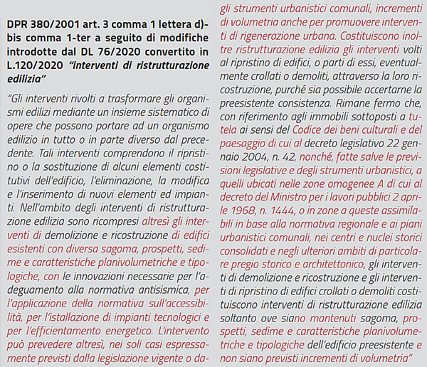 Queste importanti modifiche permettono incrementi di volumetria che possono essere realizzati con ampliamenti fuori sagoma e con il superamento dell’altezza massima dell’edificio demolito. Un’importante introduzione che, combinata alla SCIA in alternativa al Permesso a Costruire (art. 23 del TUE) e alle premialità dei piani casa, di rigenerazione urbana o del decreto sviluppo, permetteranno interventi di sostituzione del tessuto urbano in tempi ridotti e con aumenti di cubatura che incentiveranno la fattibilità economica. Ci si aspetta quindi, anche grazie al Superbonus, che questa modifica inneschi diversi interventi di rigenerazione del tessuto urbano residenziale.