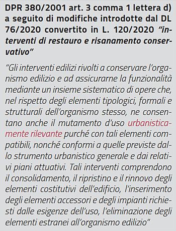 Un’altra modifica importante riguarda il cambio di destinazione d’uso e riguarda l’articolo 3 comma 1 lettera c) “interventi di restauro e di risanamento conservativo”: