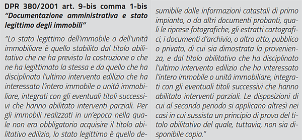 Per quanto riguarda invece la documentazione amministrativa e lo stato legittimo degli immobili le modifiche introdotte purtroppo non hanno comportato molti effetti anzi, per quanto concerne l’articolo 9-bis “Documentazione amministrativa e stato legittimo degli immobili”, con l’aggiunta del comma 1-bis: