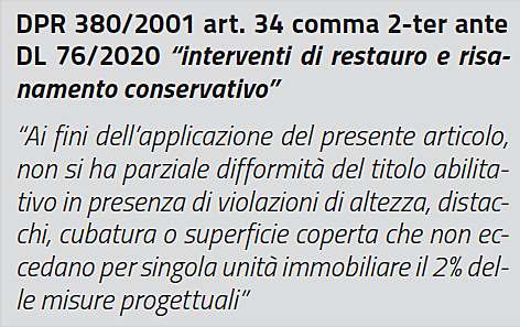 • al comma 2 viene inserito il concetto di tolleranza esecutiva. Il concetto di tolleranza esecutiva, a differenza del comma 1, viene esteso a tutti i restanti parametri urbani stici, quindi, ad esempio: le superfici lorde, nette, accessorie, superfici permeabili, gli indici di edificabilità, il rapporto di copertura, ma anche altezza interna netta.
