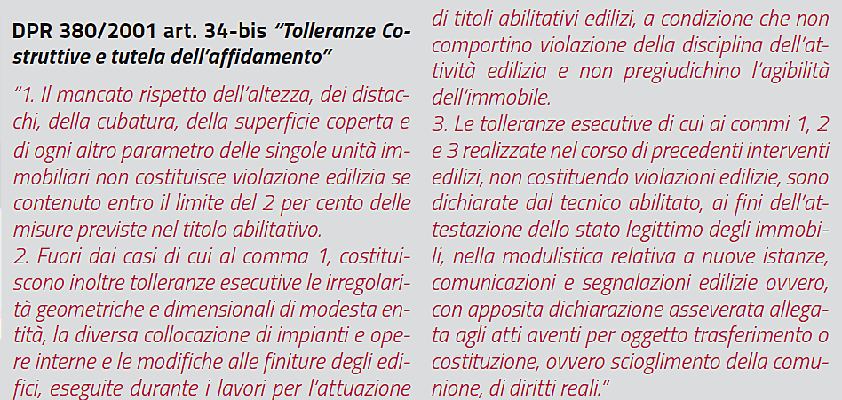 Per quanto riguarda lo stato legittimo degli immobili e le tolleranze è bene fare una puntualizzazione su un aspetto probabilmente sfuggito al legislatore: utilizzando nell’articolato la definizione di “unità immobiliare”, tale termine esclude dagli artt. 9bis e 34bis le unità collabenti.