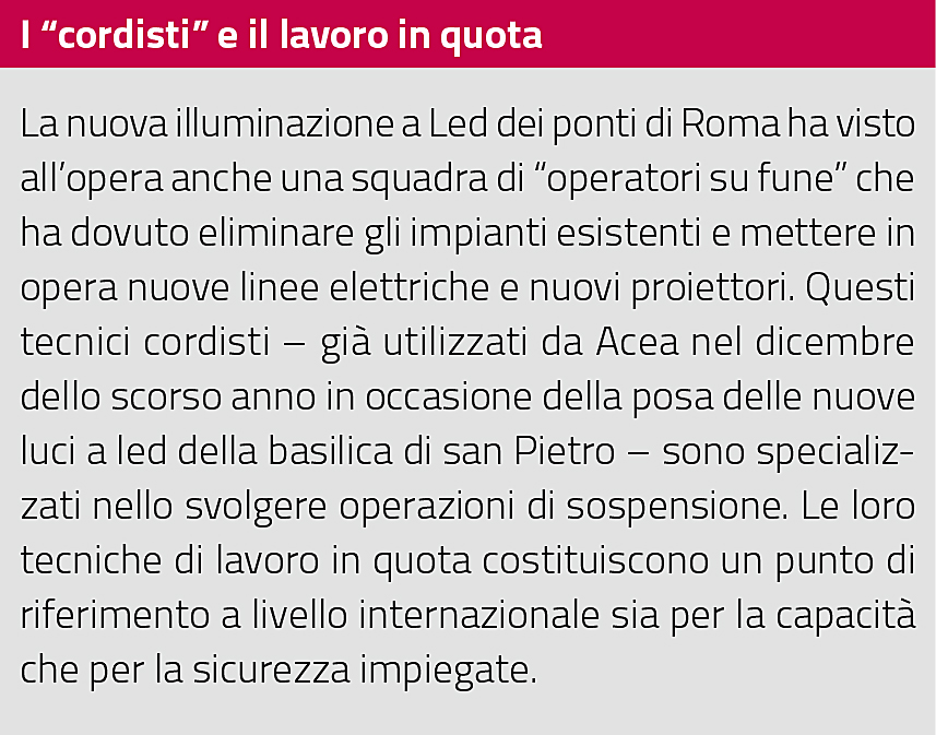 L’illuminazione a Led (si veda l’articolo di Chiara Crialesi del n. 1/ 2016, pag. 72) sta diventando protagonista dei panorami notturni delle nostre città. Ne è un ottimo esempio l’illuminazione a led di 16 ponti di Roma, che è stata – tra l’altro – l’emblema del gemellaggio univoco con Parigi in nome del vecchio motto: “Seule Paris est digne de Rome; seule Rome est digne de Paris”.