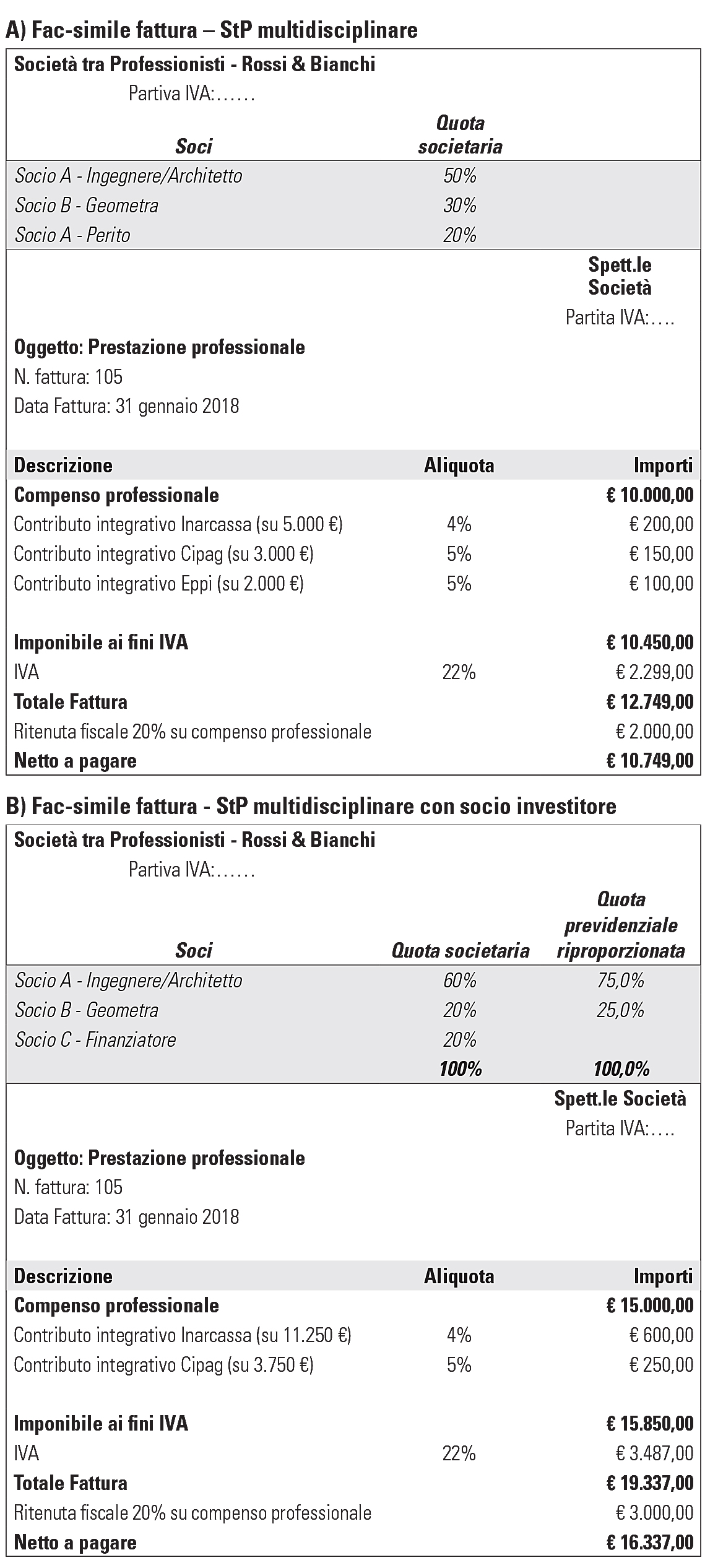 a) Società mono-disciplinare con compagine omogenea (solo soci professionisti ingegneri ed architetti): vale il criterio descritto della quota societaria (Tabella 3 caso A); b) Società mono-disciplinare con compagine mista (soci professionisti ingegneri e architetti e soci di capitale): nel caso siano presenti soci non professionisti nella compagine so ciale, la quota del contributivo integrativo a carico di ciascun socio professionista viene determinata riparametrando le quote societarie, escludendo quelle dei soci di capitale (non tenuti al versamento), in modo da garantire il pagamento integrale della contribuzione (Tabella 3 caso B); c) Società multidisciplinare (professionisti iscritti ad albi diversi con o senza soci di capitali): ciascun socio professionista è tenuto a dichiarare il volume di affari professionale in rapporto alla propria quota societaria (Tabella 3 caso C) e a versare il corrispondente contributo integrativo secondo l’aliquota stabilita dalla propria Cassa di previdenza (4% Inarcassa, 5% Eppi, 5% Cassa Geometri, 2% Epap, ecc.), riproporzionando le quote individuali in presenza soci di capitali (v. fac-simile fatturazione).