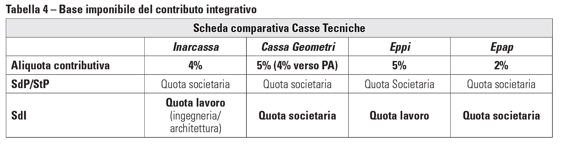 – Per quanto riguarda il sistema impositivo delle Casse tecniche, possiamo rilevare una sostanziale uniformità di disciplina in tema di Società di Professionisti (SdP) e di Società tra Professionisti (StP), in quanto tutte prevedono un prelievo del contributo integrativo sul volume di affari professionale commisurato alla quota societaria dei singoli soci professionisti. Non è uniforme invece tra le Casse il criterio adottato per il calcolo della contribuzione integrativa dovuta dalla Società di Ingegneria (SdI). A riguardo, mentre Inarcassa e l’Eppi adottano il criterio della cosiddetta quota lavoro ai fini della determinazione dell’imponibile, tenendo conto della effettiva tipologia di prestazione eseguita (conformemente al Decreto ministeriale citato), la Cassa Geometri e l’Epap utilizzano il criterio della quota societaria ovvero della quota posseduta dai soci iscritti alle rispettive Casse (Tabella 4). In questo caso la presenza nell’ambito societario delle SdI di soci appartenenti a Casse che determinano l’aliquota contributiva con modalità diverse (quota lavoro o societaria) rende impossibile determinare quale sia la forma di compilazione della fattura che sia compatibile con le discipline di tutte le Casse coinvolte. c) Associazione professionale (art. 1 legge 1815/1939) – Lo Studio associato è la prima forma di collaborazione organizzata per l’esercizio di attività professionale, costituito esclusivamente tra soggetti regolarmente iscritti ad un albo e comprendente nella denominazione il nome e il cognome di tutti gli associati (art. 1 legge 1815/1939). L’incarico viene affidato dal cliente al singolo professionista e non allo studio che non ha personalità giuridica e assume rilievo solo nei rapporti tra gli associati. La collaborazione tra soggetti che esercitano una professione “protetta” e soggetti che esercitano una professione “non protetta” non può avvenire nella forma dell’associazione professionale, essendo espressamente vietata la costituzione di una associazione “mista” (art. 1 legge 1815/1939). L’Associazione professionale non ha obblighi diretti verso Inarcassa, in quanto sia gli obblighi dichiarativi che quelli contributivi ricadono unicamente sugli associati, in rapporto alla rispettiva quota associativa.
