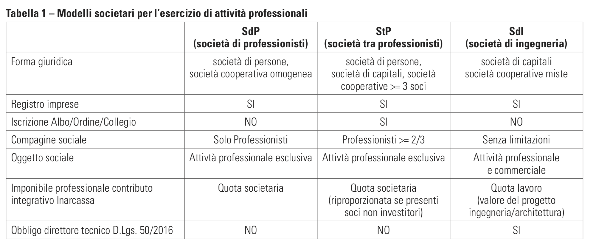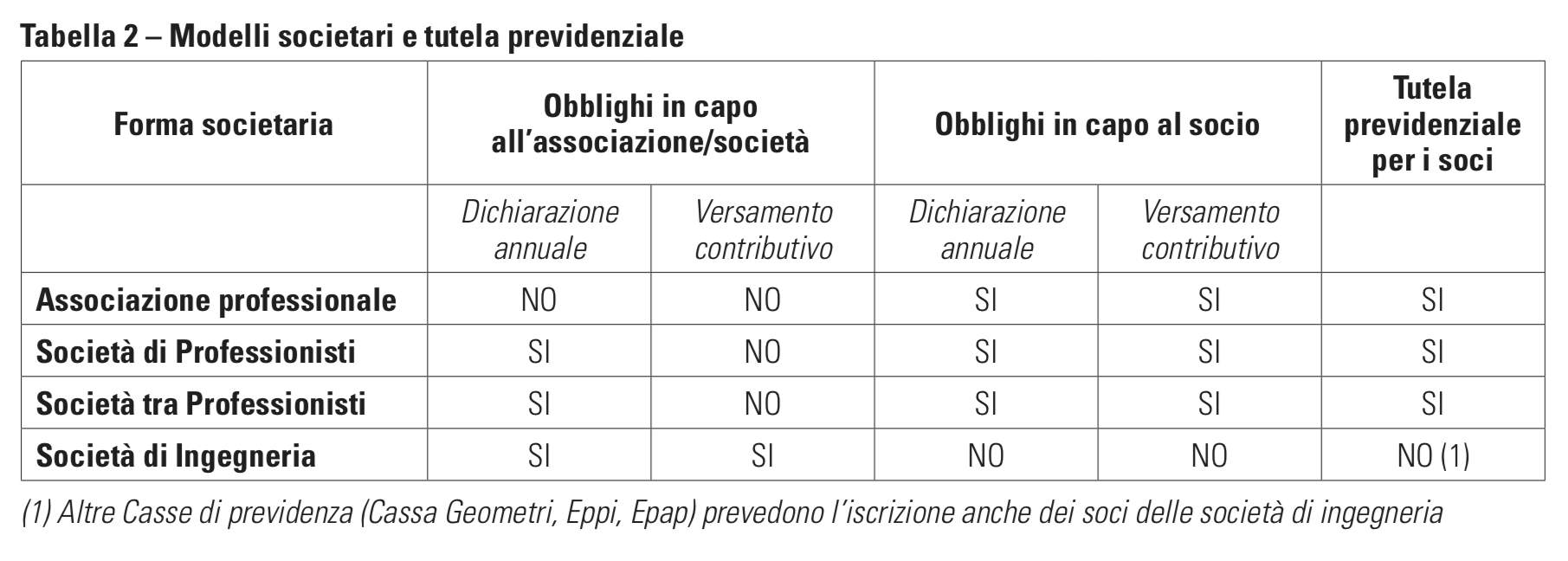 Società professionali e tutela previdenziale del socio I modelli proposti, fatta eccezione per le Società di Ingegneria, abilitano il socio professionista ingegnere o architetto all’iscrizione ad Inarcassa e alla relativa copertura previdenziale e assistenziale, qualora non sia già soggetto ad altra forma di previdenza obbligatoria (Tabella 2).