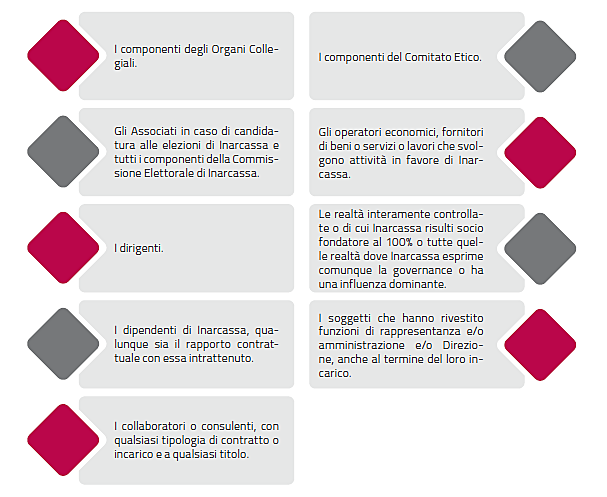 Per la scelta dei suoi componenti devono essere presi in considerazione elementi quali l’esperienza e la sensibilità rispetto ai valori da tutelare, nonché la conoscenza della vita associativa, del sistema delle casse previdenziali e del sistema ordinistico. Non possono essere nominati soggetti che risultano contestualmente tra i destinatari del presente Codice Etico, come indicati al capitolo 3, fatta eccezione per i soggetti che hanno rivestito funzioni di rappresentanza di Inarcassa.