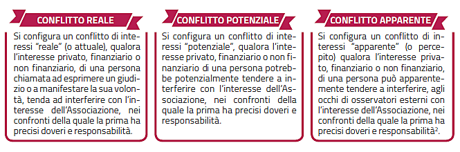 1. la cointeressenza, palese o occulta, del soggetto destinatario del Codice o dei suoi familiari (parente e affine entro il secondo grado, coniuge o convivente) in attività di fornitori o, in genere, di soggetti terzi che entrino in rapporti economici con l’Associazione; 2. la strumentalizzazione della propria funzione per la realizzazione di interessi contrastanti con quelli dell’Associazione; 3. l’uso di informazioni acquisite dallo svolgimento delle proprie funzioni a vantaggio proprio o di terzi, in contrasto con gli interessi dell’Associazione; 4. lo svolgimento di attività lavorative di qualunque genere, anche di consulenza, continuativa o saltuaria, presso fornitori o terzi che abbiano comunque rapporti economici in corso con l’Associazione, ad eccezione degli incarichi autorizzati dalla stessa; 5. la conclusione, il perfezionamento, l’avvio di trattative o la stipula di contratti in nome e per conto dell’Associazione, allorché la controparte sia un familiare (parente e affine entro il secondo grado, coniuge o convivente) o socio del soggetto destinatario del Codice; 6. l’uso a proprio vantaggio di opportunità di cui sia venuto a conoscenza nello svolgimento della propria attività lavorativa o istituzionale sottraendola all’Associazione; 7. l’accettazione di denaro o altro beneficio o favore da persone, enti o aziende che sono, o intendono entrare, in rapporto di affari con l’Associazione.