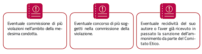 • Tipologia della violazione compiuta; • Rilevanza degli obblighi violati ed entità del danno o del grado di pericolo arrecato all’Ente, agli utenti o a terzi dal disservizio determinatosi come conseguenza dell’infrazione; • Circostanze nel cui ambito si è sviluppata la condotta; • Presenza e intensità dell’elemento intenzionale; grado di negligenza, imprudenza o imperizia dimostrate, tenuto conto anche della prevedibilità dell’evento; • Ai fini dell’eventuale aggravamento della sanzione devono, altresì, essere considerati i seguenti elementi: