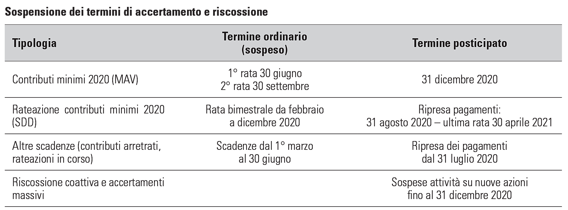 Riscossione coattiva e accertamenti massivi (valido anche per le società). Sono sospese fino al 31 dicembre 2020 le nuove azioni di riscossione coattiva su importi scaduti verso professionisti e società, fatte salve le procedure già avviate e affidate all’Agente di Riscossione o al recupero giudiziale. Sono altresì sospese fino al 31 dicembre 2020 le attività di accertamento verso professionisti e società salvo quelle indifferibili.