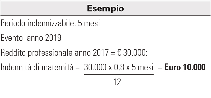 Misura dell’indennità - L’indennità di maternità è determinata nella misura di cinque dodicesimi dell’80% del reddito professionale dichiarato dall’iscritta nel secondo anno anteriore a quello dell’evento.