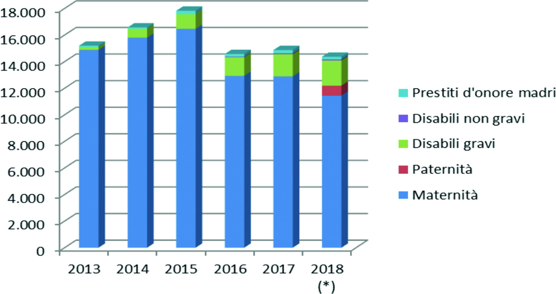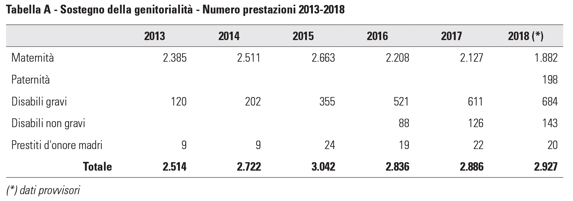 La nostra Associazione negli ultimi anni è stata particolarmente sensibile a questi temi e ha attivato una serie di misure a favore degli iscritti e delle iscritte con figli a carico. Accanto alla tradizionale prestazione di maternità, l’Associazione sostiene con un assegno mensile gli iscritti con figli disabili gravi, eroga prestiti d’onore a tasso zero alle libere professioniste con figli in età fino alla scuola dell’obbligo. Dal 1° gennaio 2018 ha, inoltre, introdotto l’assegno di paternità. Ulteriori iniziative a favore della genitorialità sono allo studio sul versante della protezione sanitaria. Nel corso dell’anno 2018 circa 3.000 nuclei familiari hanno beneficiato del sostegno dell’Associazione (Tabella A) per un importo complessivo di circa 15 milioni di euro di prestazioni erogate (Grafico 1). In questa sessione vengono illustrate le prestazioni di maternità e paternità, tra le più rilevanti dal punto di vista degli effetti economici e delle positive ricadute per le famiglie dei nostri iscritti.