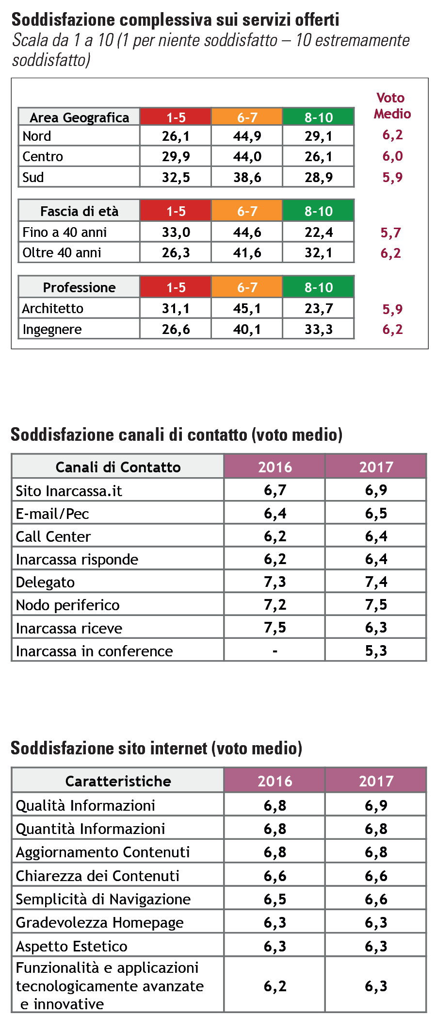 È quanto emerge dall’indagine di customer satisfaction con la metodologia CAWI (Computer Assisted Web Interviewing ovvero l’associato viene invitato, tramite email, a compilare il questionario su un apposito sito web), annunciata lo scorso anno (vedi rivista n. 2/2017) ed effettuata durante il 2017. Sono stati raccolti 3.034 questionari nel corso di cinque rilevazioni (aprile, maggio, giugno, luglio e settembre) a seguito dell’invio di 34.714 inviti complessivi con una redemption pari quindi a circa il 9% (tasso definito dal partner molto soddisfacente per questo tipo di indagine). Al fine di garantire la continuità di lettura e interpretazione dei risultati con l’indagine del 2016, è stata mantenuta la stessa struttura del questionario con le sole modifiche dovute alle novità relative ai nuovi servizi introdotti (Inarcassa Ascolta, InarcassaMobile, invio avvisi di cortesia …) e alcuni accorgimenti di stesura per migliorare la comprensione delle domande. La soddisfazione globale degli associati rispetto ai servizi offerti dalla Associazione è mediamente sufficiente ( voto medio 6,0), in leggero aumento (nel 2016 era pari a 5,8) e con un perfetto bilanciamento tra i due estremi dell’intervallo di valutazione: 28,1% di eccellenza (voto 8-10) e 29,0% di insoddisfazione (voto 1-5) contro i 22,9% e 34,1% del 2016. Si segnalano alcune differenze confrontando i risultati per categorie socio-demografiche.