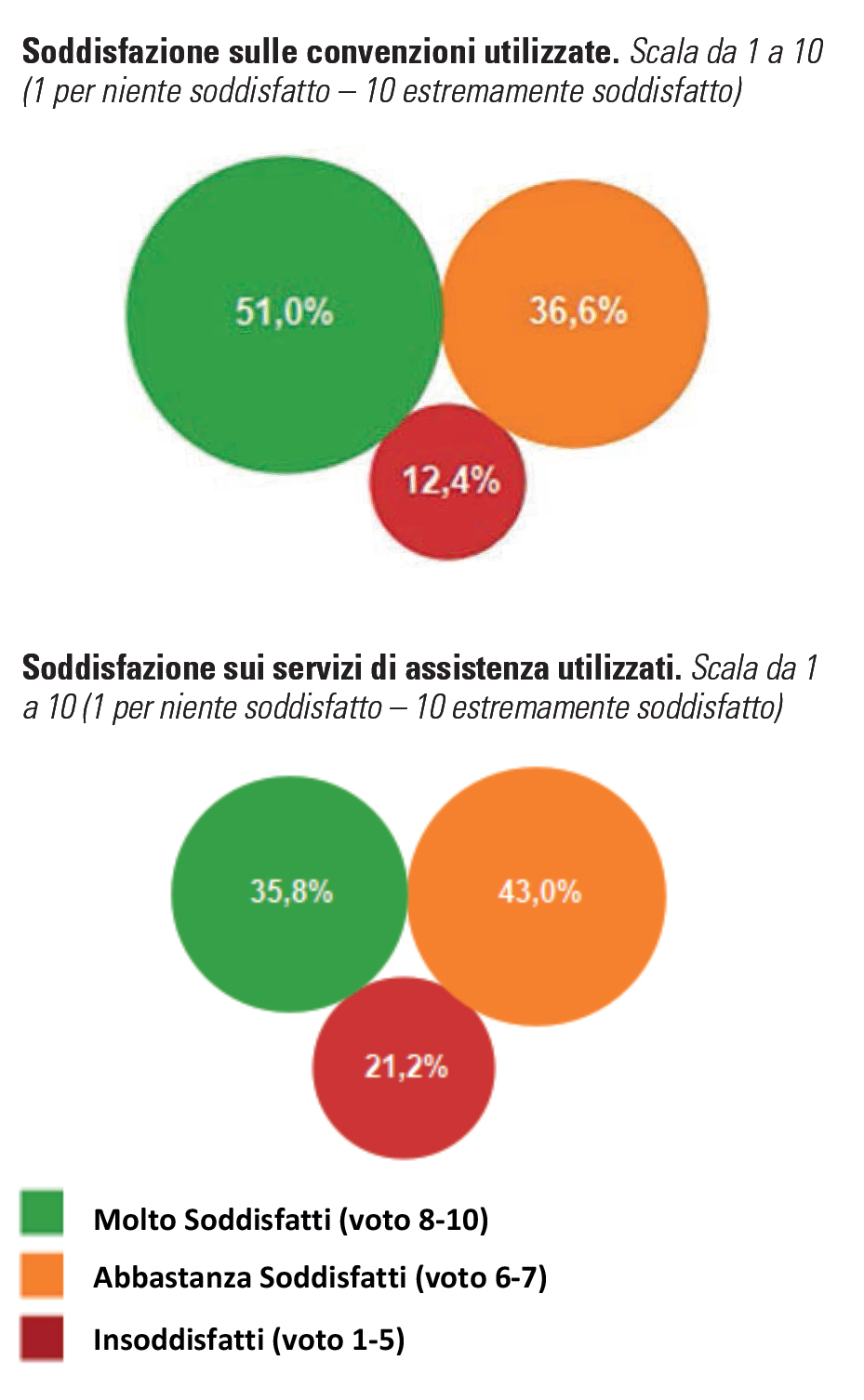 Il livello di conoscenza dei principali servizi di assistenza e delle convenzioni è complessivamente buono tra gli associati, con percentuali variabili in base al profilo e alle effettive esigenze di utilizzo. Al netto dell’utilizzo effettivo, gli associati dimostrano interesse per questa tipologia di offerta con un voto medio pari a 7,4 per l’assistenza e 7,8 per le convenzioni. La valutazione media dei servizi legati all’assistenza è pari a 6,5 con 35,8% degli associati che si dichiara molto soddisfatto, mentre per le convenzioni è pari a 7,2 (con 51% di utenti molto soddisfatti).