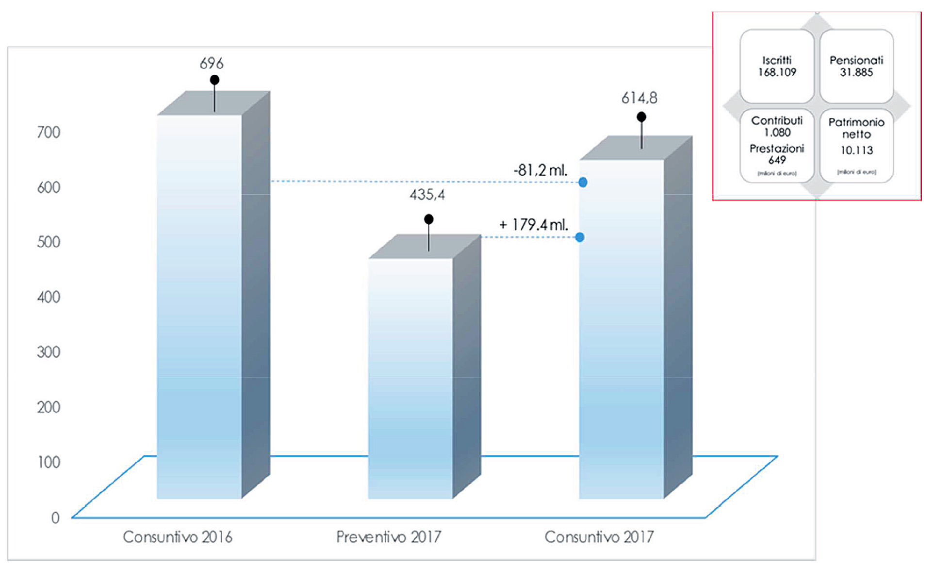 La lettura di un rendiconto tradizionale può risultare tuttavia meno complicata se sono chiari quali sono i messaggi che il documento può esprimere e dove è possibile rintracciarli. Immaginiamo di soffrire di un disturbo visivo da dovere correggere e di entrare, per questo motivo, in un negozio di ottica. Troveremo la risposta ad ogni esigenza: lenti per presbiti se il nostro problema sta nella capacità di veder bene da vicino, lenti per miopi se la nostra difficoltà è la distanza e lenti per astigmatici se invece abbiamo un problema di “messa a fuoco”. Immaginiamo ora di dover leggere un bilancio e di essere affetti da tutti e tre i disturbi: presbiopia, miopia e astigmatismo. Nessun problema perché il bilancio, attraverso la sua struttura, ci fornisce gli “occhiali” per vedere ogni elemento. Il conto economico, che racconta la storia di un anno, ci permette di vedere bene da vicino. Con lo Stato Patrimoniale, che descrive l’accumulo dall’inizio dell’attività alla data di chiusura del bilancio, ci permette di “correggere” la nostra miopia sul lungo periodo. Con il rendiconto finanziario, che descrive la capacità della gestione di autofinanziarsi, migliora la nostra “messa a fuoco”. È evidente, quindi, che solo con la lettura di tutti e tre i documenti avremo una visione chiara dello stato di salute di un’azienda. Vediamo ora cosa è accaduto in Inarcassa, iniziando dalla vista di breve periodo. Il 2017 si è chiuso con un avanzo economico di 614,8 milioni di euro rispetto ai 696,0 milioni di euro dell’anno 2016 e ai 435,4 milioni di euro del budget 2017. Si tratta di un risultato ottenuto attraverso la gestione di volumi oramai indubbiamente ragguardevoli. Oltre 168 mila iscritti vengono garantiti con l’erogazione di servizi di carattere assistenziale e sociale ai quali si aggiungono le iniziative mirate a sostenere la professione. Circa 32 mila famiglie ricevono ogni mese dalla loro Cassa una pensione, espressione dei principi solidaristici del loro sistema previdenziale. Un volume di contributi che, nel 2017, è stato pari a 1.080 milioni di euro a fronte di prestazioni istituzionali che, tra previdenza e assistenza, hanno raggiunto, nello stesso anno, i 649 milioni di euro. Ma cosa è successo ai numeri di lungo periodo? Uno sguardo allo Stato patrimoniale ci mostra che il Patrimonio dell’Associazione, cresciuto in misura corrispondente al risultato dell’anno, ha superato i 10 miliardi di euro, raggiungendo i 10.113 milioni di euro. La riserva legale continua ad essere quindi ben superiore alle cinque annualità previste dal D.Lgs. n. 509/94, con un rapporto di copertura che si attesta al valore di 16,68. La lettura del rendiconto finanziario, infine, dimostra la capacità della gestione dell’anno 2017 di autofinanziarsi.
