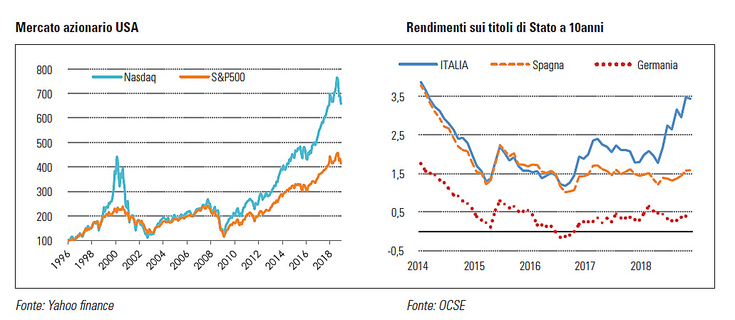 L'economia mondiale ha attraversato negli ultimi anni una fase di espansione forte e diffusa che ha portato il tasso di disoccupazione globale vicino ai minimi del 5%. A partire da metà anno, tuttavia, sono aumentati i segnali di un rallentamento del ciclo, anche per effetto della frenata del commercio internazionale e della guerra dei dazi tra Cina e Stati Uniti. Rispetto al 2017, la crescita appare adesso più disomogenea: rimane robusta negli Stati Uniti, dove l’economia beneficia di stimoli fiscali aggiuntivi e del prolungato rialzo delle quotazioni azionarie, rallenta invece nell’area Euro. La frenata coinvolge la Francia e soprattutto la Germania. In Italia, nonostante un incremento, anche se modesto, delle esportazioni, le stime del III trimestre 2018 indicano una flessione del Pil causata da un netto calo degli investimenti; il calo degli ordinativi delle imprese anticipa poi una probabile flessione del Pil anche nel IV trimestre dell’anno. Tutti questi indicatori sono il segnale di una crescente incertezza e di un indebolimento del clima di fiducia di famiglie e imprese sulle prospettive di sviluppo anche a breve termine dell’economia italiana. È l’incertezza, ad esempio, a spingere le famiglie verso i mutui a tasso fisso, che a fine 2018 hanno toccato il picco del 90% delle nuove erogazioni, nonostante il variabile sia ai minimi storici, o a lasciare in parte invenduta l’ultima emissione di BTP.