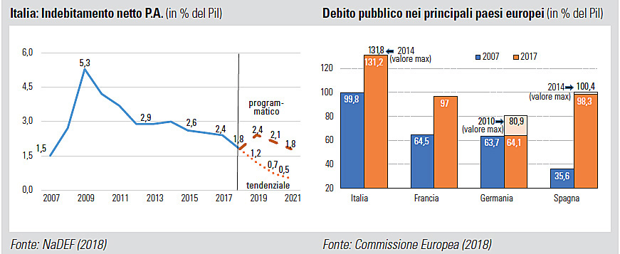 Sempre nel quadro programmatico, il debito pubblico dovrebbe evidenziare un profilo lievemente decrescente, passando dal 131,2% del Pil nel 2017 al 126,7% nel 2021. Nello scorso decennio, il debito sul Pil è aumentato in tutte le maggiori economie europee a seguito della recessione. In alcuni paesi, come Germania e Spagna, il ritorno della crescita economica (più elevata rispetto all’Italia) ha già consentito la riduzione del debito sul Pil. In Francia, il rapporto ha invece continuato ad aumentare fino al 2017. In Italia il picco è stato raggiunto nel 2014; nel triennio successivo la riduzione è stata di 0,6 punti.