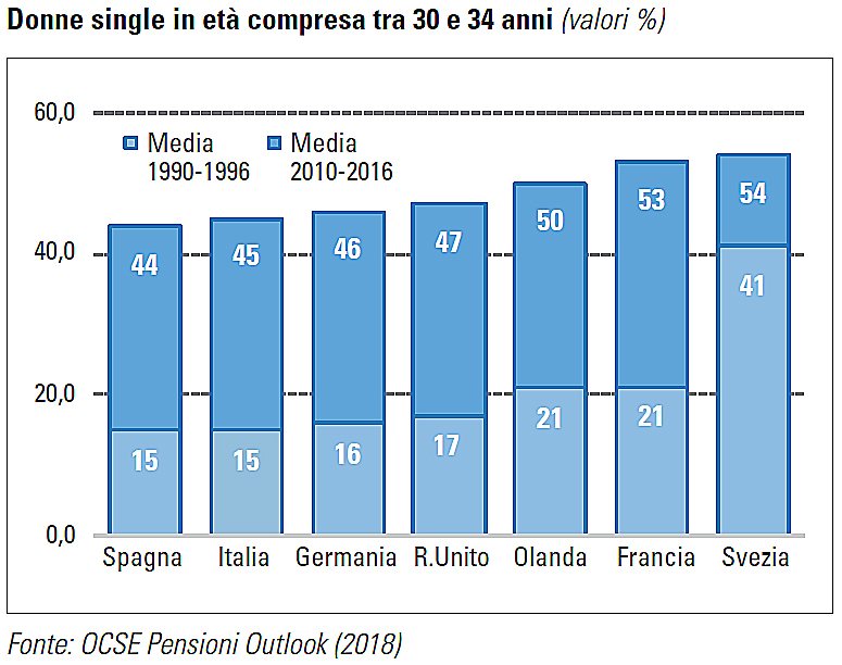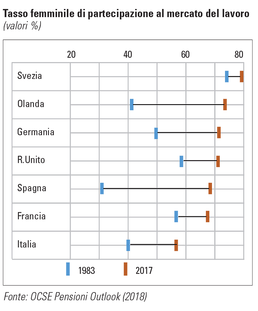Presenza delle donne nel mercato del lavoro. I tassi femminili di partecipazione al mercato del lavoro, pur con rilevanti differenze tra paesi, sono aumentati in tutte le maggiori economie europee. Alcuni paesi, come Svezia, Danimarca e Finlandia, registrano da sempre tassi di attività per le donne molto elevati, dell’ordine del 75-80%. Negli ultimi 30 anni, Olanda, Germania e, soprattutto, Spagna hanno registrato un consistente aumento fino ad arrivare a livelli del 70%. In Italia il tasso di attività femminile è aumentato dal 2000 di 10 punti percentuali, portandosi nel 2017 al 57%, ma rimane ancora su valori relativamente bassi. Il diverso ruolo della donna nella società è stato accompagnato anche da profondi cambiamenti nella struttura familiare, con l’aumento delle unioni di fatto e dei nuclei familiari composti da una sola persona. Nel periodo 2010-2016, nella media dei paesi OCSE, il 38% delle donne in età compresa tra 30 e 34 anni non vive in coppia (unioni legali o unioni di fatto), a fronte del 19% nel periodo 1990- 1996 e del 12% nei primi anni ’60. In Francia e Svezia questa percentuale supera il 50%, ma anche nelle altre principali economie europee si colloca su livelli piuttosto elevati, di poco inferiori al 50%. Si è registrata una progressiva diminuzione della quota di coniugi superstiti, cioè della platea potenziale degli aventi diritto alla pensione di reversibilità. Tra la popolazione compresa tra 65 e 69 anni questa quota rappresenta circa il 20% in Germania, Italia e Spagna, a fronte di livelli sopra il 30% nella media del periodo 1990-1996. In Olanda, Francia e Regno Unito è pari a circa il 15% e si riduce ad appena il 10% in Svezia.