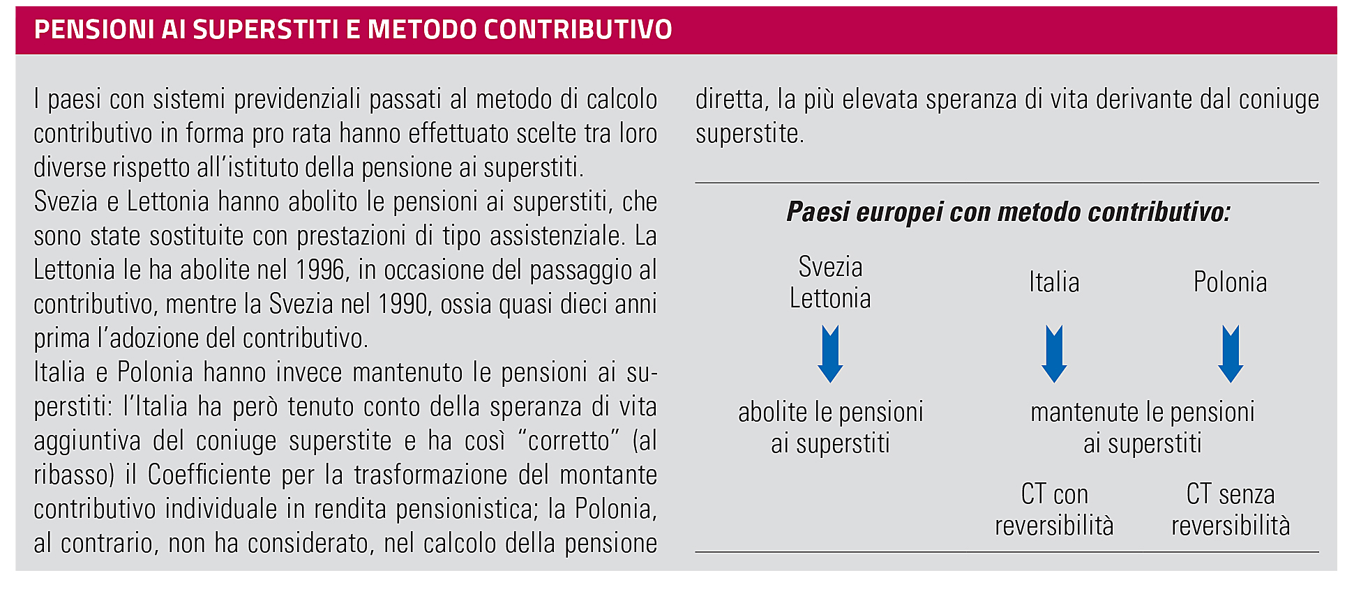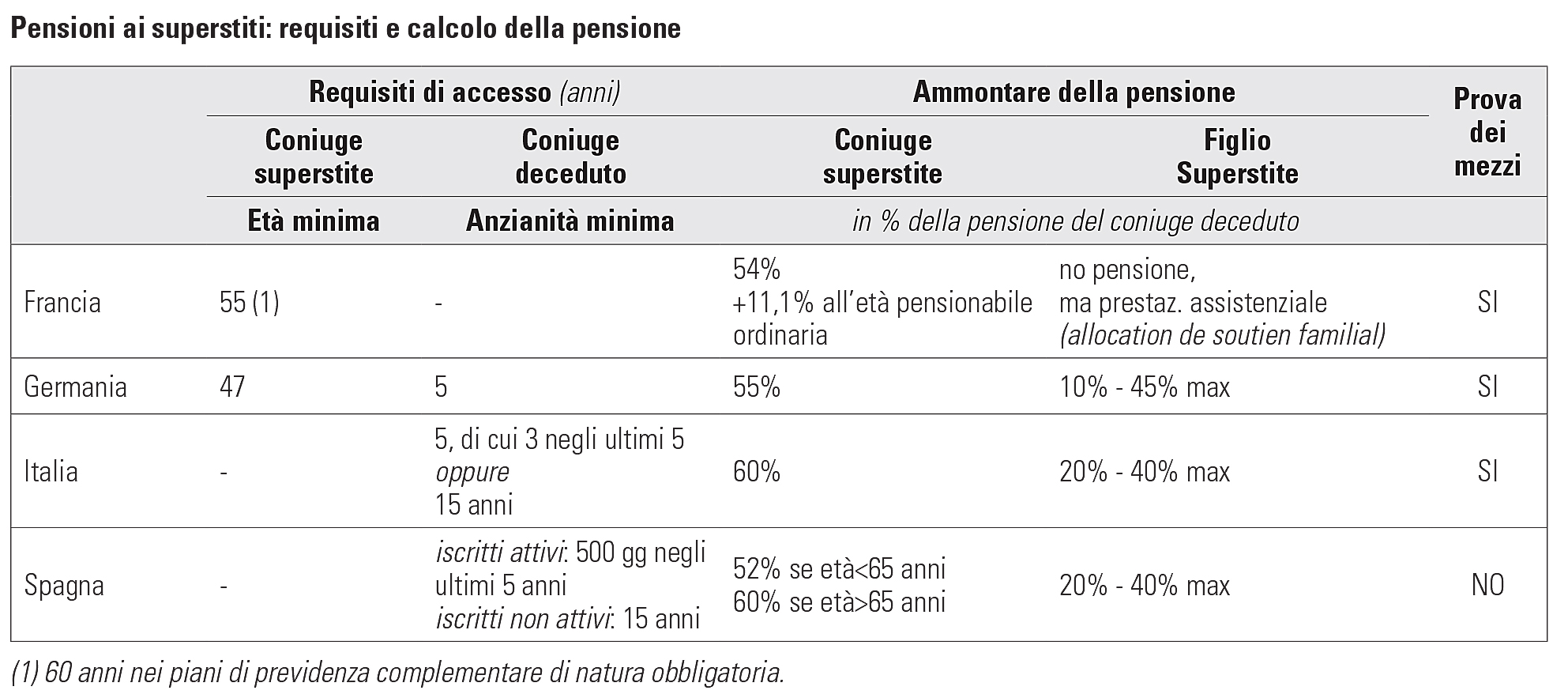Ammontare della pensione ai superstiti. In Italia la prestazione è pari al 60% della pensione diretta del coniuge deceduto; in Germania, in seguito alla riforma delle pensioni del 2001, è stata ridotta dal 60% al 55%. In Francia e Spagna la quota è pari, rispettivamente, al 54% e al 52%, ma arriva al 60% o oltre al raggiungimento dell’età pensionabile ordinaria da parte del coniuge superstite. Per il figlio superstite, Spagna e Italia prevedono il 20% della pensione del coniuge deceduto, mentre la Germania il 10%.
