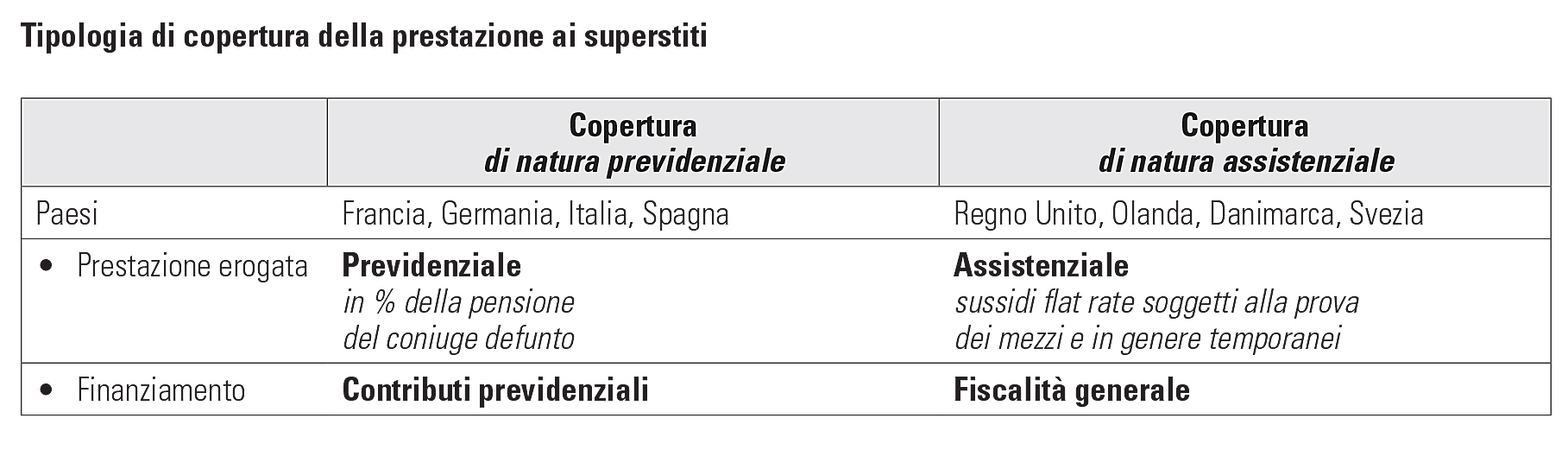 Tutti i paesi avanzati prevedono l’erogazione di prestazioni economiche a favore del coniuge superstite. Gli assetti normativi, tuttavia, evidenziano una situazione piuttosto variegata. È possibile infatti classificare i paesi in due grandi gruppi, in base al tipo di “copertura” prevista: di natura previdenziale oppure di natura assistenziale. La maggior parte dei paesi europei adotta il “modello classico”, cioè la copertura previdenziale: si tratta di prestazioni che rientrano nelle cosiddette Pensioni IVS (Invalidità, Vecchiaia, Superstiti), generalmente determinate in percentuale della pensione spettante al coniuge defunto. La fonte di finanziamento è data dai contributi sociali sui redditi da lavoro. In altri paesi (Regno Unito, Olanda, Danimarca e Svezia), la copertura è assicurata da prestazioni assistenziali, garantite a tutti i cittadini in base alle loro condizioni socio-economiche e/o familiari. In questi casi, il finanziamento avviene tramite la fiscalità generale. Questa distinzione segna anche uno spartiacque nella dimensione del fenomeno. La copertura di natura assistenziale comporta oneri molto contenuti, intorno all’1% del Pil. Le “classiche” pensioni ai superstiti presentano invece livelli di spesa più elevati: in Francia e Germania la spesa è pari a poco meno del 2% del Pil; si arriva al 2,3% in Spagna e al 2,6% in Italia che, unitamente alla Grecia (2,7%), presenta i livelli più elevati. Le dinamiche di spesa riflettono anche il numero di beneficiari, piuttosto alto in Italia, Germania e Spagna e contenuto in Regno Unito, Svezia e Olanda, dove ci sono meno di 20 pensionati superstiti ogni 100 pensionati di vecchiaia. Questo dipende da una disciplina meno favorevole e da più elevati tassi di attività femminili; dipende anche dal fatto che, soprattutto in Olanda, i superstiti sono destinatari di sussidi assistenziali che non vengono quindi classificati come pensioni.