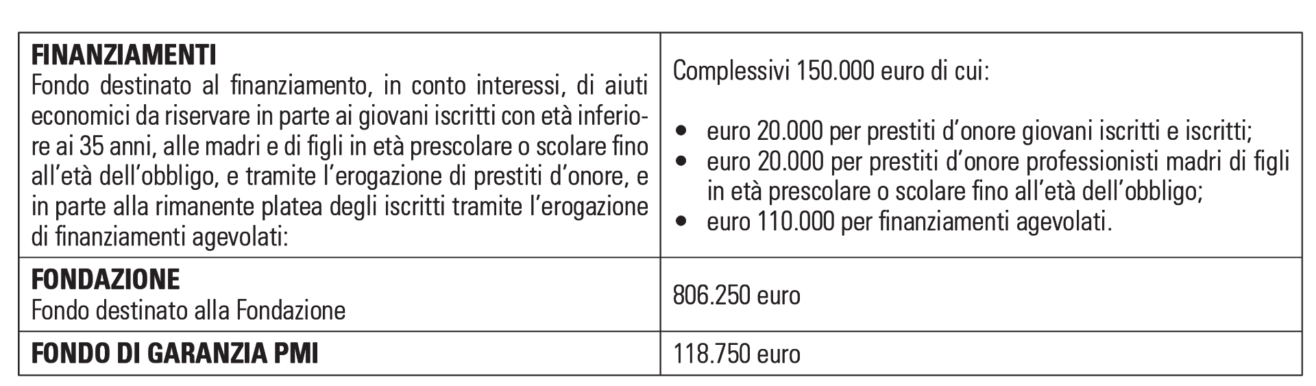 Covid-19: ulteriori misure Sulla base della deliberazione del 25 marzo 2020 che ha stabilito di apportare al Bilancio di previsione 2020 una variazione di 100 milioni di euro, destinando una quota corrispondente dell’avanzo economico alle “Prestazioni Assistenziali”, il CdA delibera di sottoporre alla prima riunione utile del Comitato Nazionale dei Delegati la proposta di impiegare 100 milioni di euro in prestazioni assistenziali riguardanti: • Finanziamenti a tasso zero agli iscritti, • Costituzione di un fondo di garanzia al fine di agevolare l’accesso al credito, • Sussidio una tantum per iscritti e pensionati non iscritti per contagio da Covid-19, • Sussidio una tantum per iscritti titolari di pensione di invalidità e ai superstiti.
