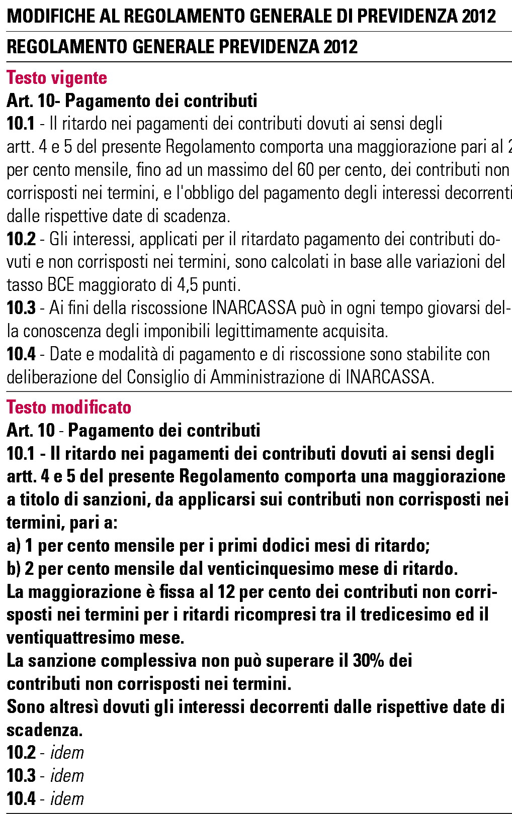 Il CND delibera di modificare l'art. 10 del Regolamento Generale Previdenza 2012 come di seguito: